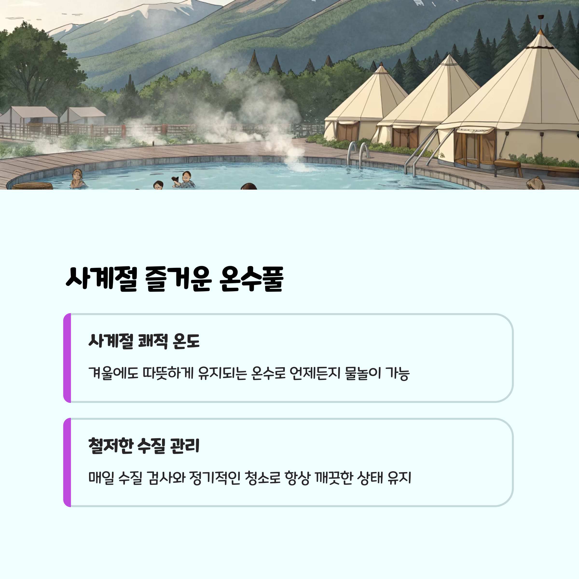 - 체크인 당일 오후 3시~저녁 9시(동계 7시)까지 운영하며, 퇴실일에는 수질 관리로 이용이 제한됩니다.