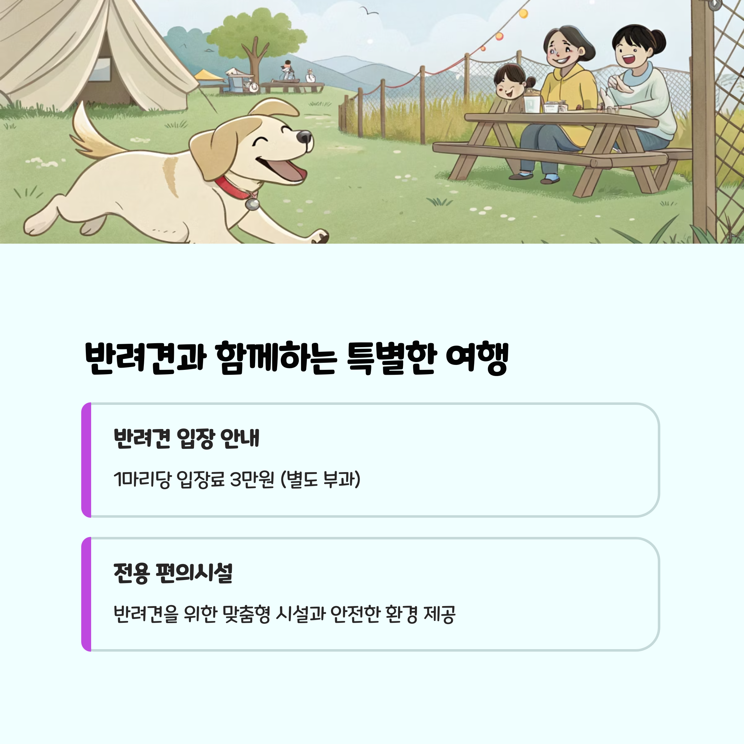 애견 동반 가능 객실: 비치발리, 텍사스 등 다양한 스타일의 글램핑 객실이 준비되어 있습니다.애견 입장료: 1마리당 30,000원(사전 문의 필수), 추가 시 별도 요금 발생.최대 인원: 객실별 기준 2인~4인, 인원 추가 시 요금 부과(성인 30,000원, 아동 20,000원).