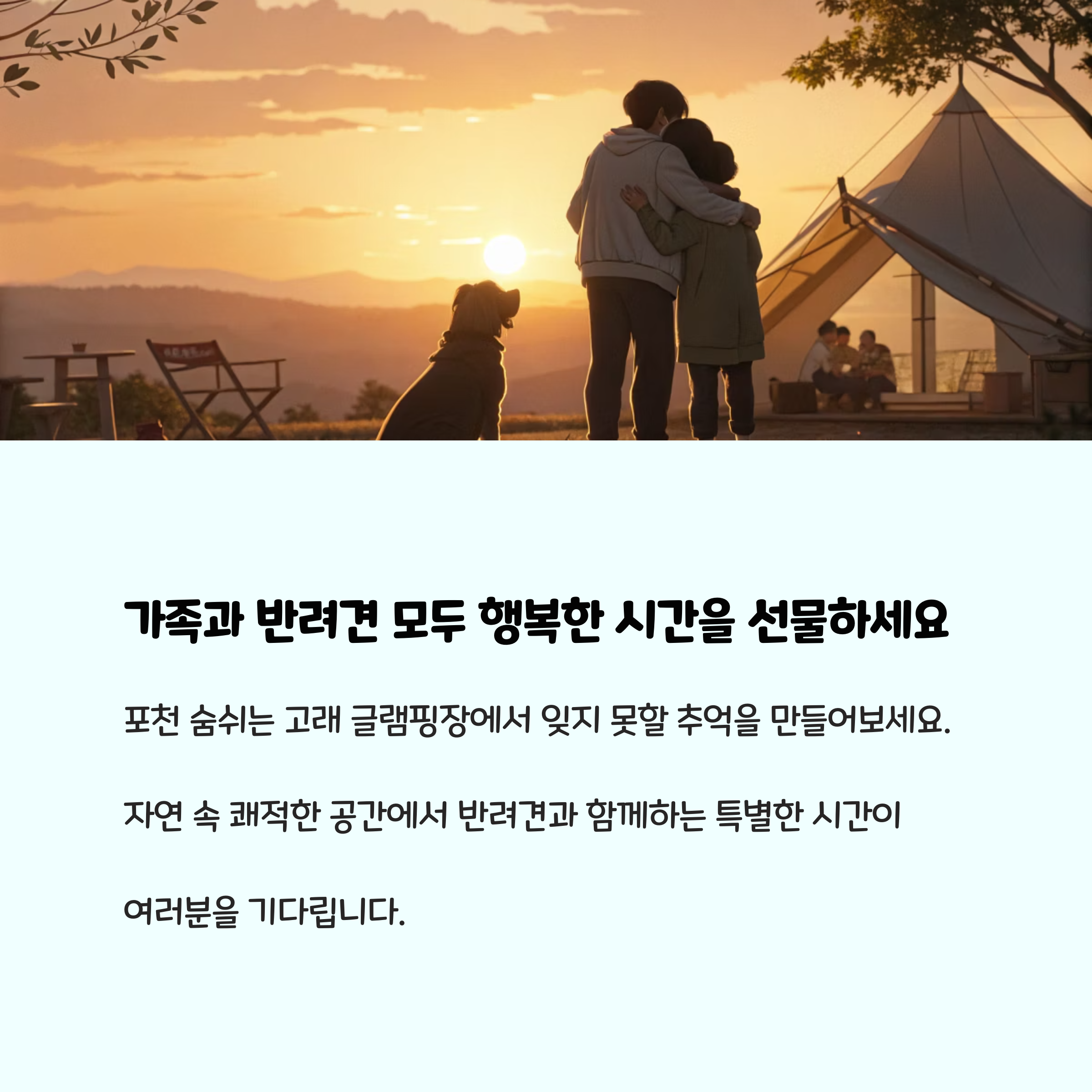 포천 숨 쉬는 고래 글램핑장은 가족과 반려견 모두가 만족할 수 있는 최적의 공간입니다. 쾌적한 시설과 친절한 서비스, 그리고 자연 속에서의 힐링까지 모두 누릴 수 있어, 특별한 날을 더욱 의미 있게 만들어줍니다. 반려견과 함께하는 여행을 계획 중이라면, 이곳에서 소중한 추억을 만들어보세요.