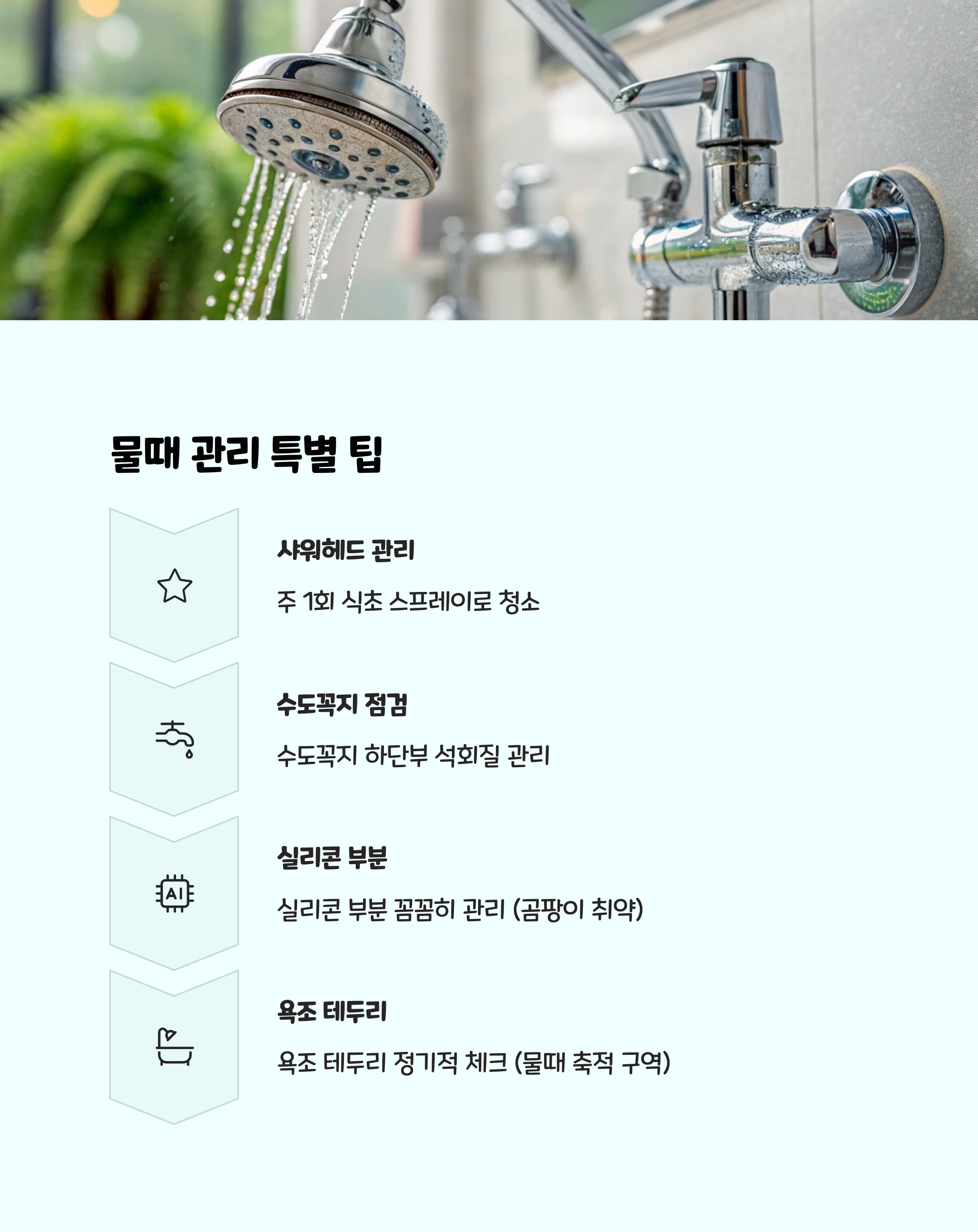 샤워 후에는 욕실용 스퀴지나 극세사 타월로 벽과 바닥의 물기를 빠르게 닦아줍니다. 물기만 잘 제거해도 물때와 곰팡이 발생률이 크게 줄어듭니다. 실제로 이 루틴만으로도 2주 이상 욕실을 깔끔하게 유지할 수 있다는 후기가 많습니다.