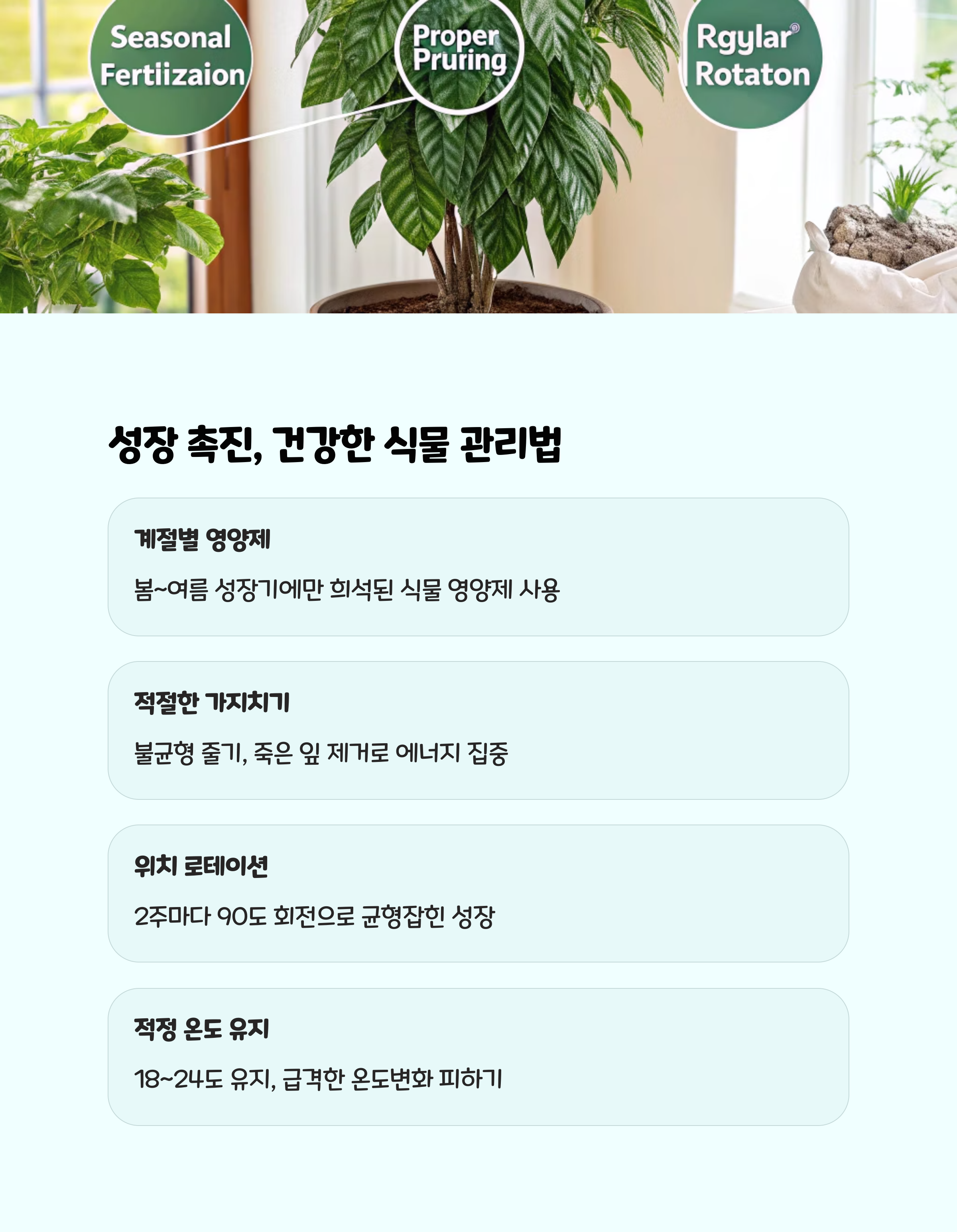 • 마른 잎, 시든 가지를 잘라내 건강한 성장을 돕고, 해충 예방에도 효과적입니다.