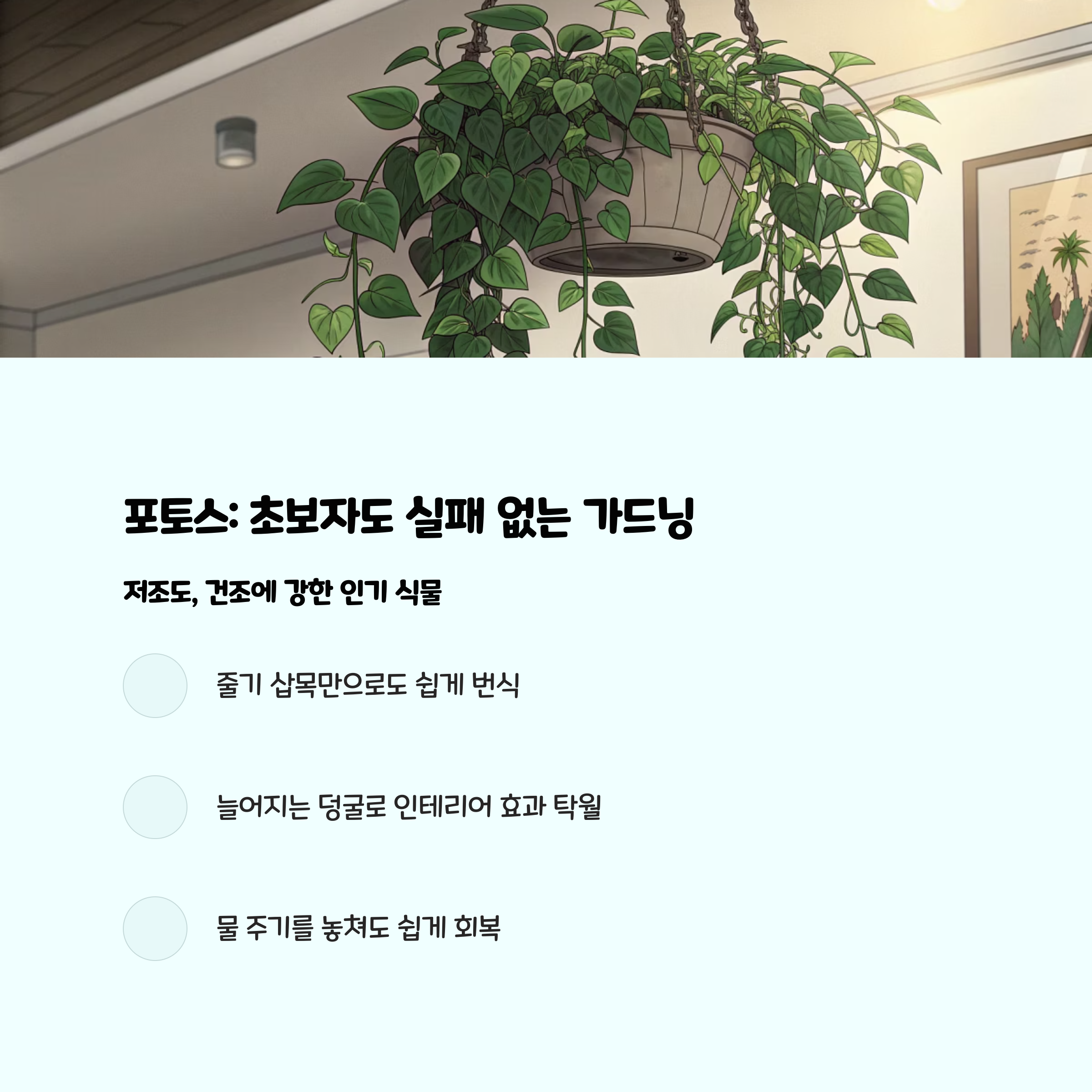 | 포토스(데빌스 아이비) | ‘죽지 않는 식물’로 불릴 만큼 강인, 행잉플랜트로도 인기 | 매우 쉬움 |