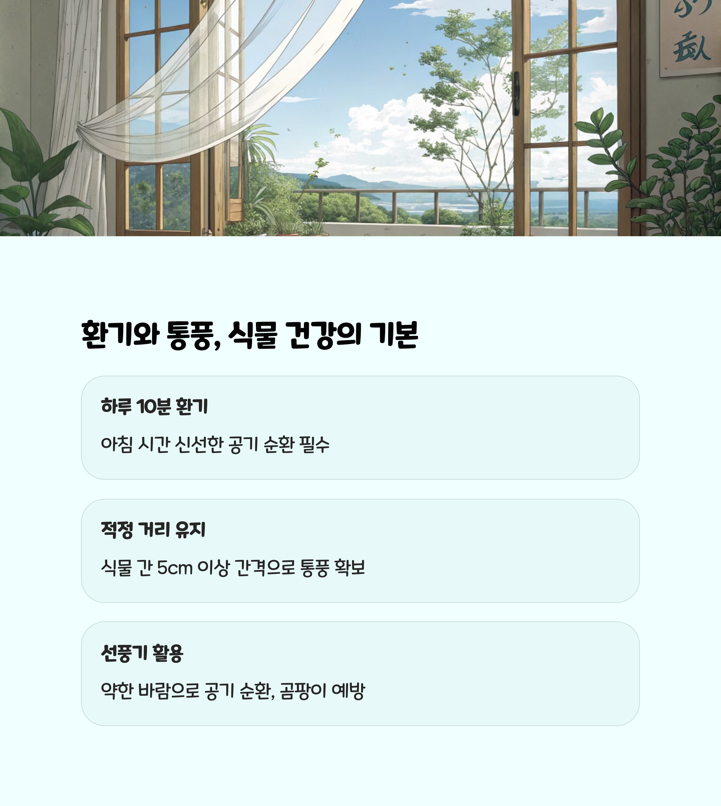 분무기로 잎에 물을 뿌려주고, 주기적으로 창문을 열어 환기시키세요. 공기순환이 잘 되면 식물 건강에 도움이 됩니다.