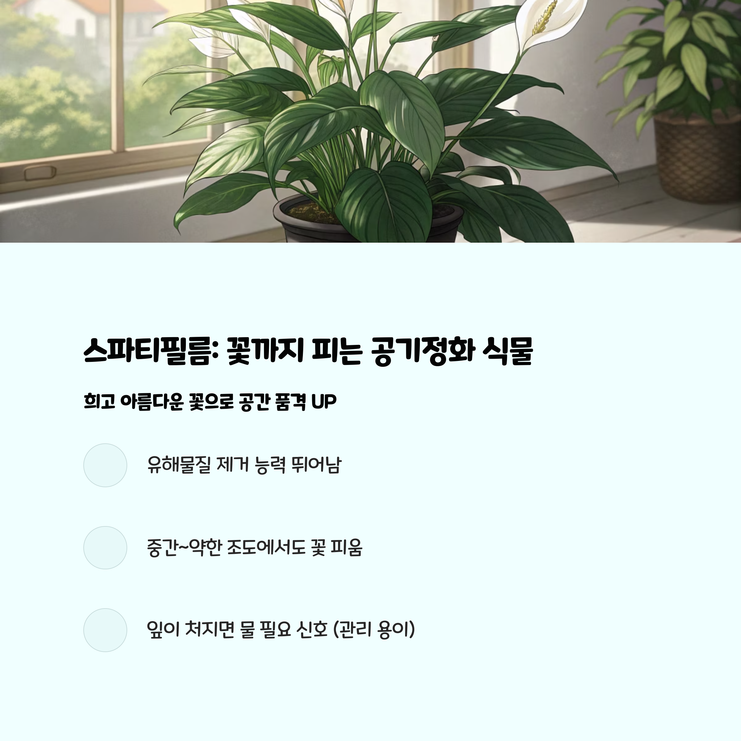 스파티필름(평화의 백합) 적은 빛에서도 꽃을 피우며, 공기정화 효과 뛰어남 쉬움