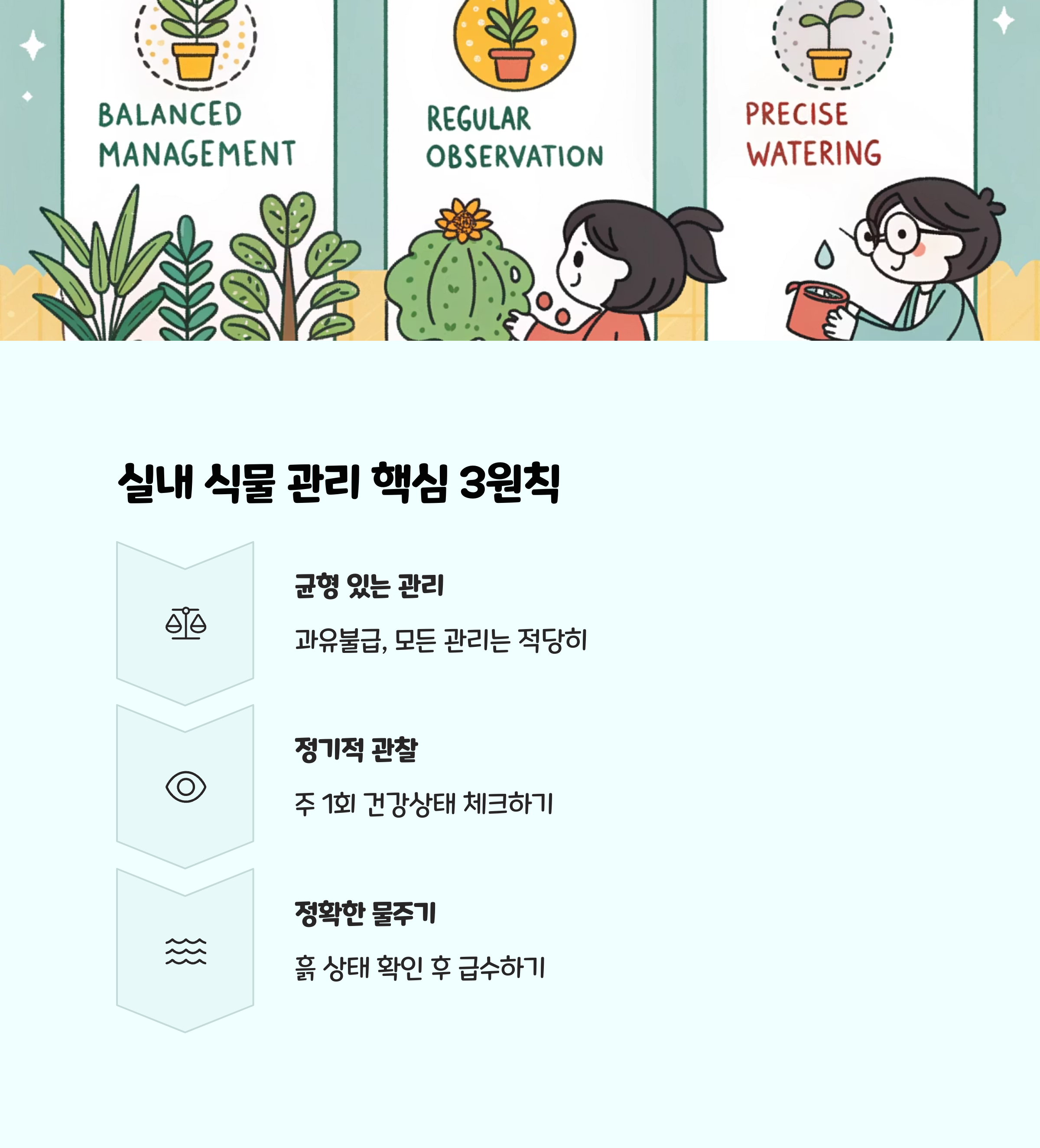 - 새로 들인 식물은 2주 정도 격리해 해충 유입을 막고, 흙과 잎 상태를 자주 점검하세요.