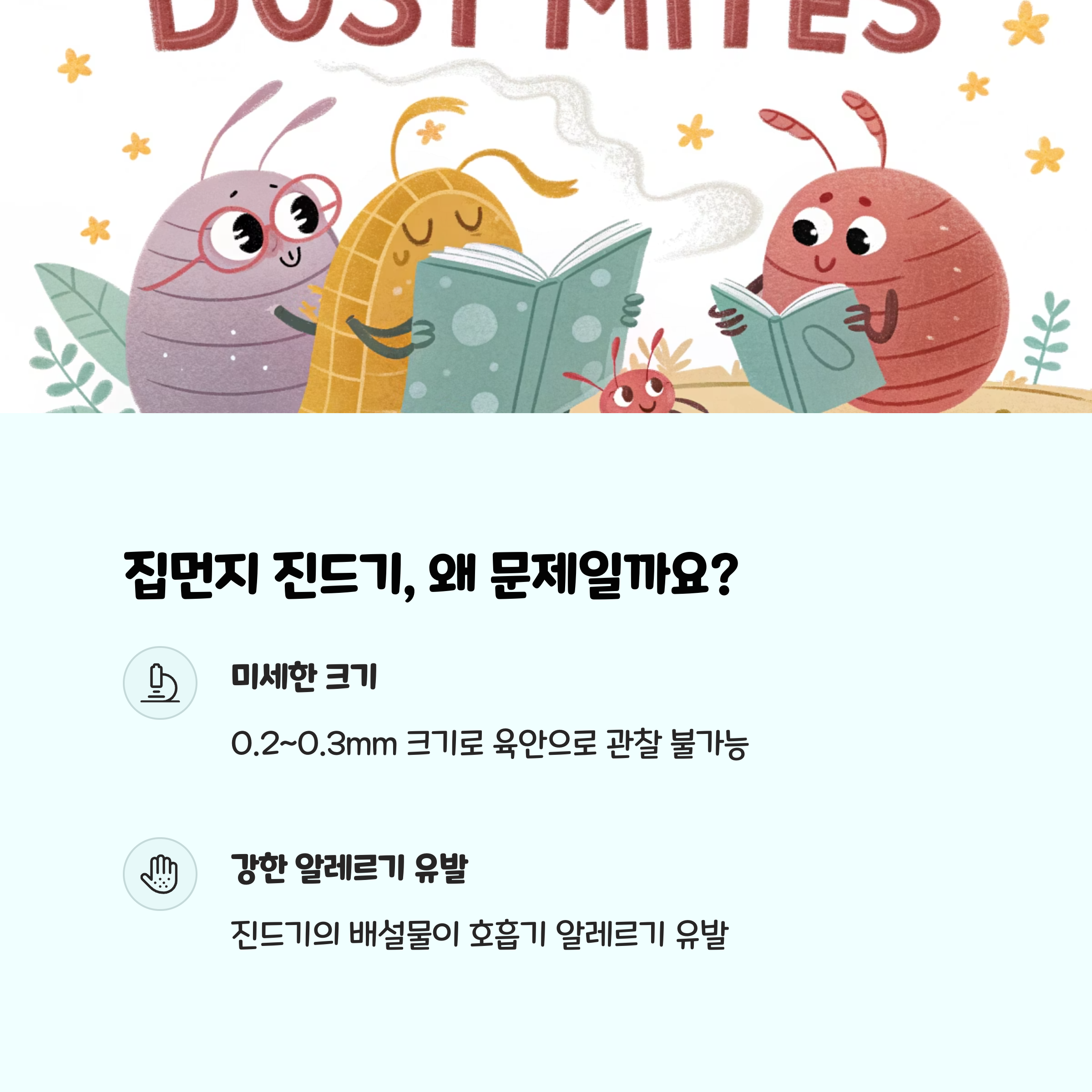 집먼지 진드기의 사체와 배설물이 공기 중에 퍼지면 호흡기를 자극해 알레르기 비염, 천식, 아토피 피부염 등 다양한 알레르기 질환을 유발하거나 증상을 악화시킵니다. 특히 면역력이 약한 어린이나 노약자에게 더 큰 영향을 줍니다.