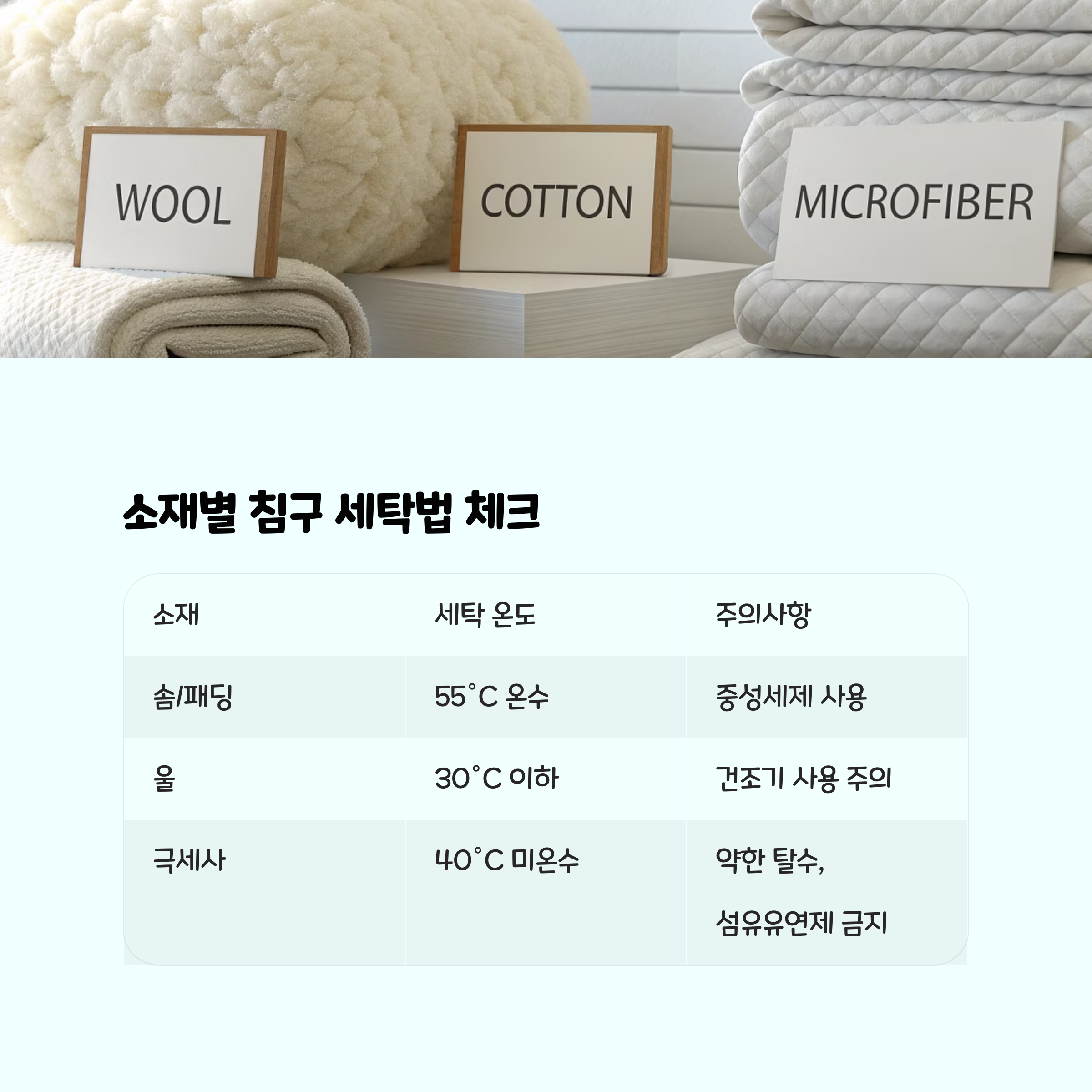 | 침구 소재 | 세탁 주기 및 방법 | 교체 권장 주기 |