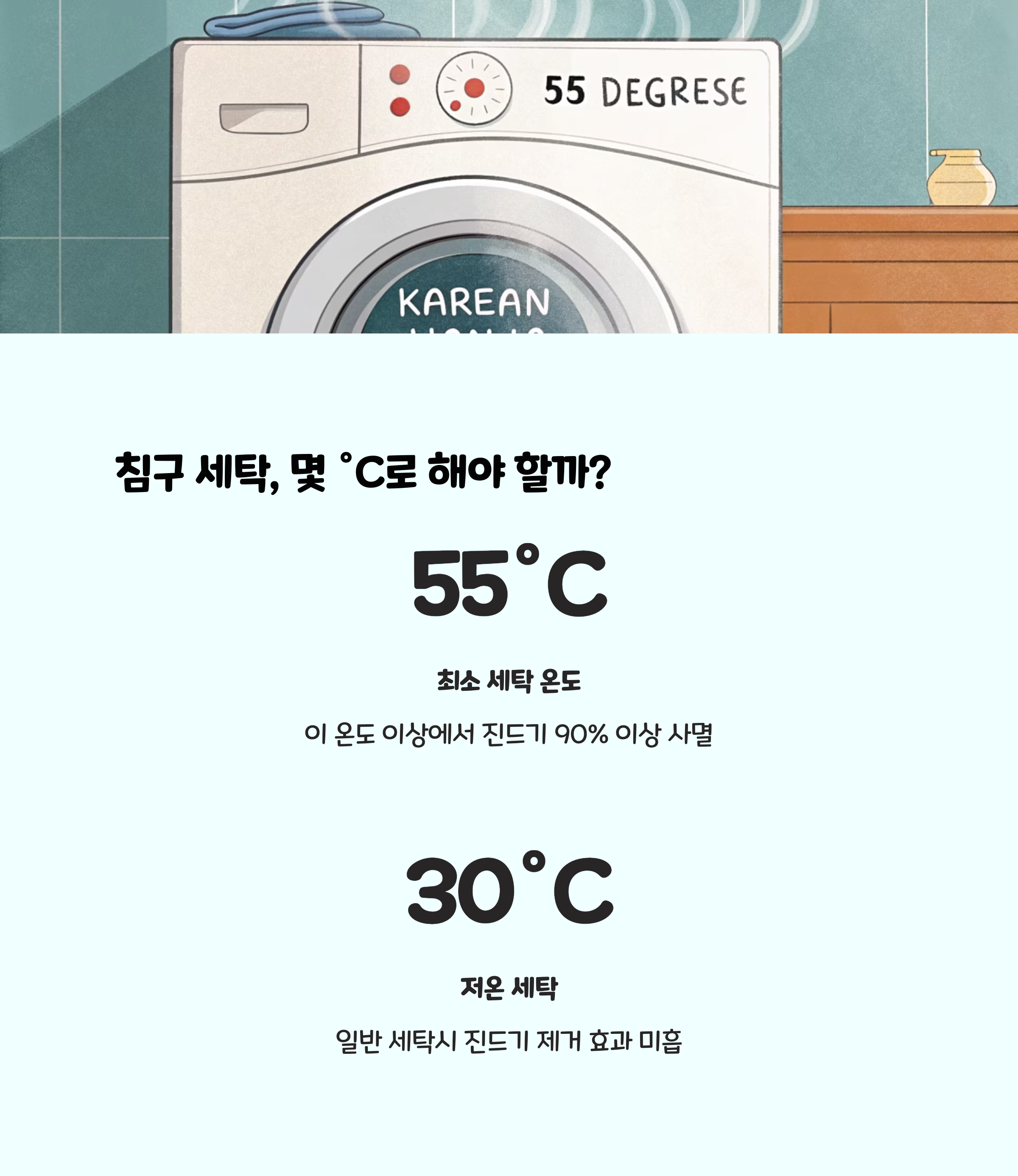 - 세탁 시 55~60도 이상의 온수를 사용하면 진드기와 세균을 효과적으로 제거할 수 있습니다.
