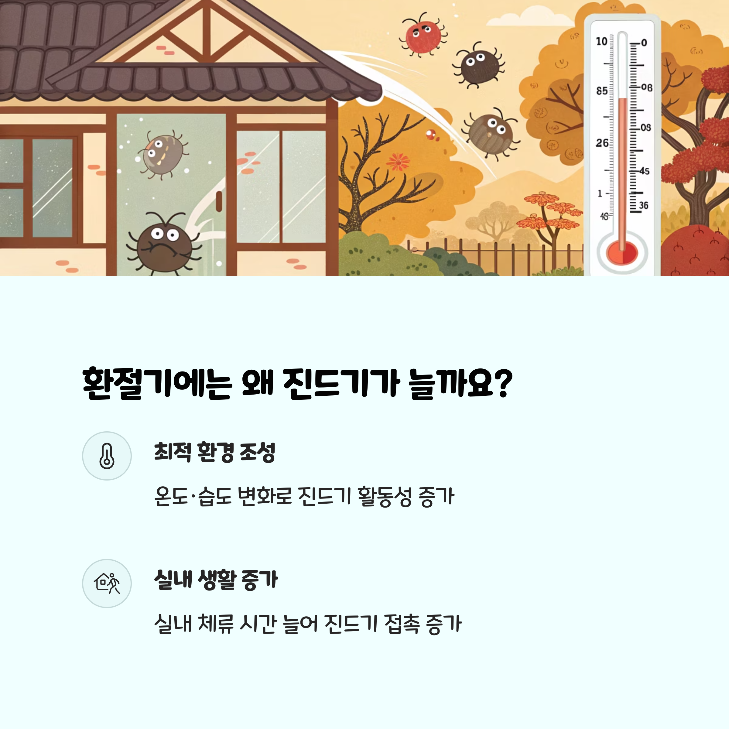 - 실내 습도는 50~55% 이하, 온도는 18~20℃로 유지하면 진드기 번식을 억제할 수 있습니다.