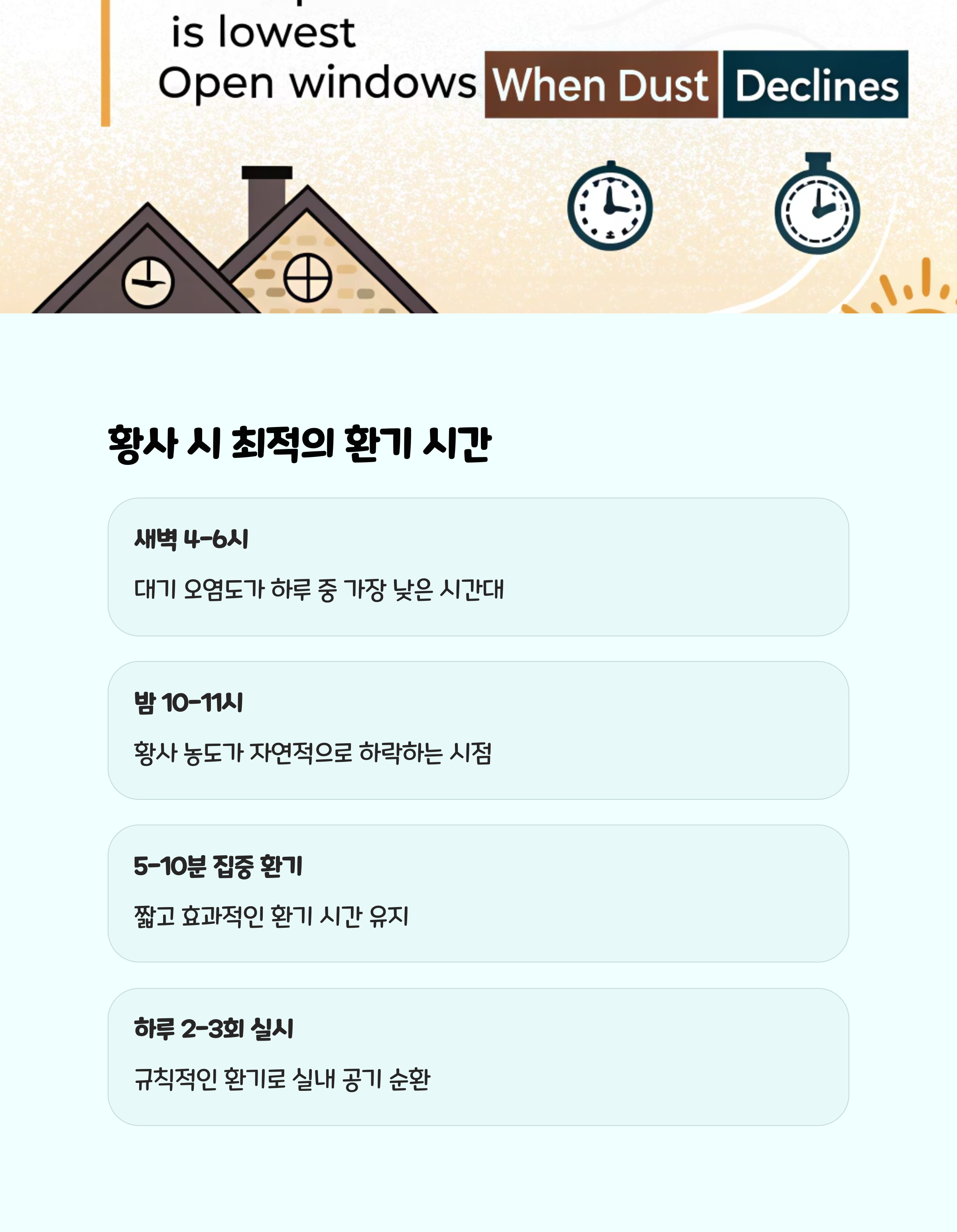 황사가 심한 날에도 실내 공기 정체를 막기 위해 하루 2~3회, 새벽이나 밤처럼 외부 미세먼지가 적은 시간대에 5~10분 정도 짧게 환기하는 것이 좋습니다. 이렇게 하면 실내 이산화탄소 농도를 낮추고 신선한 공기를 공급할 수 있습니다.