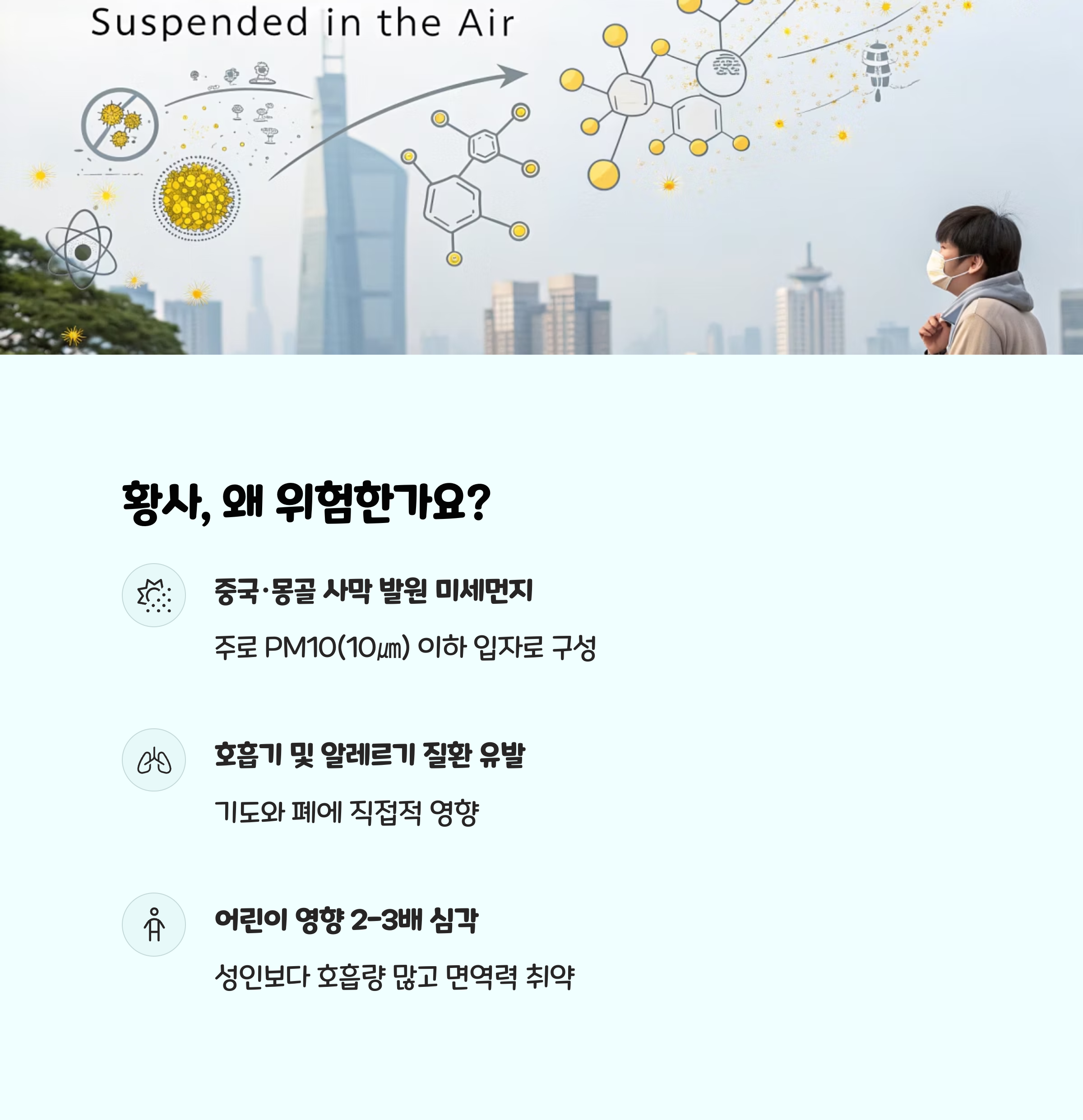 황사와 미세먼지는 호흡기 질환, 알레르기, 천식 악화 등 아이들의 건강에 직접적인 영향을 줍니다. 특히 어린아이들은 면역력이 약해 공기 중 유해물질에 더 민감하기 때문에, 실내 공기질을 깨끗하게 유지하는 것이 필수적입니다. 황사 경보가 있을 때는 창문을 닫고 외부 공기 유입을 차단하는 것이 기본이며, 실내 공기 정화에 집중해야 합니다.