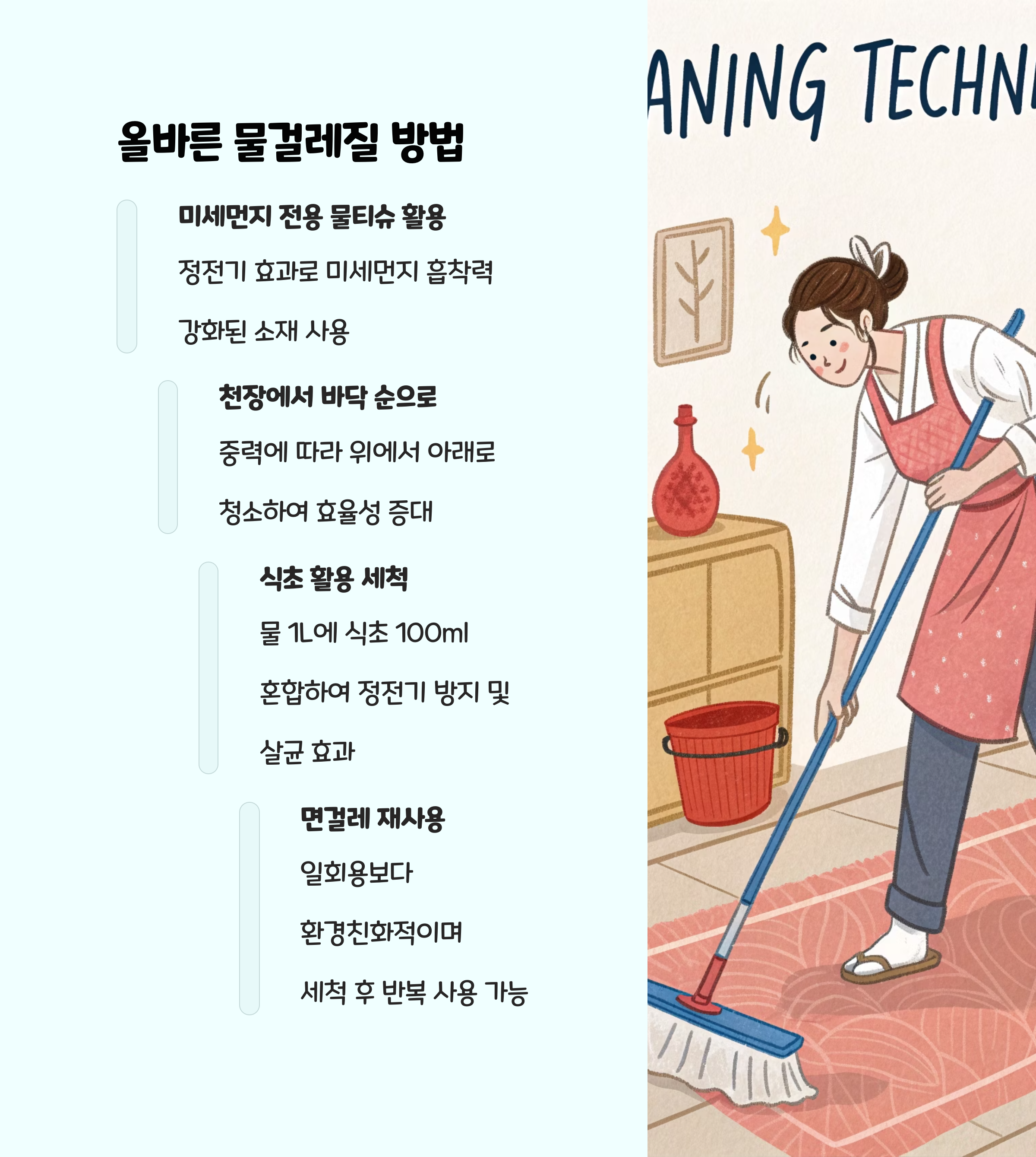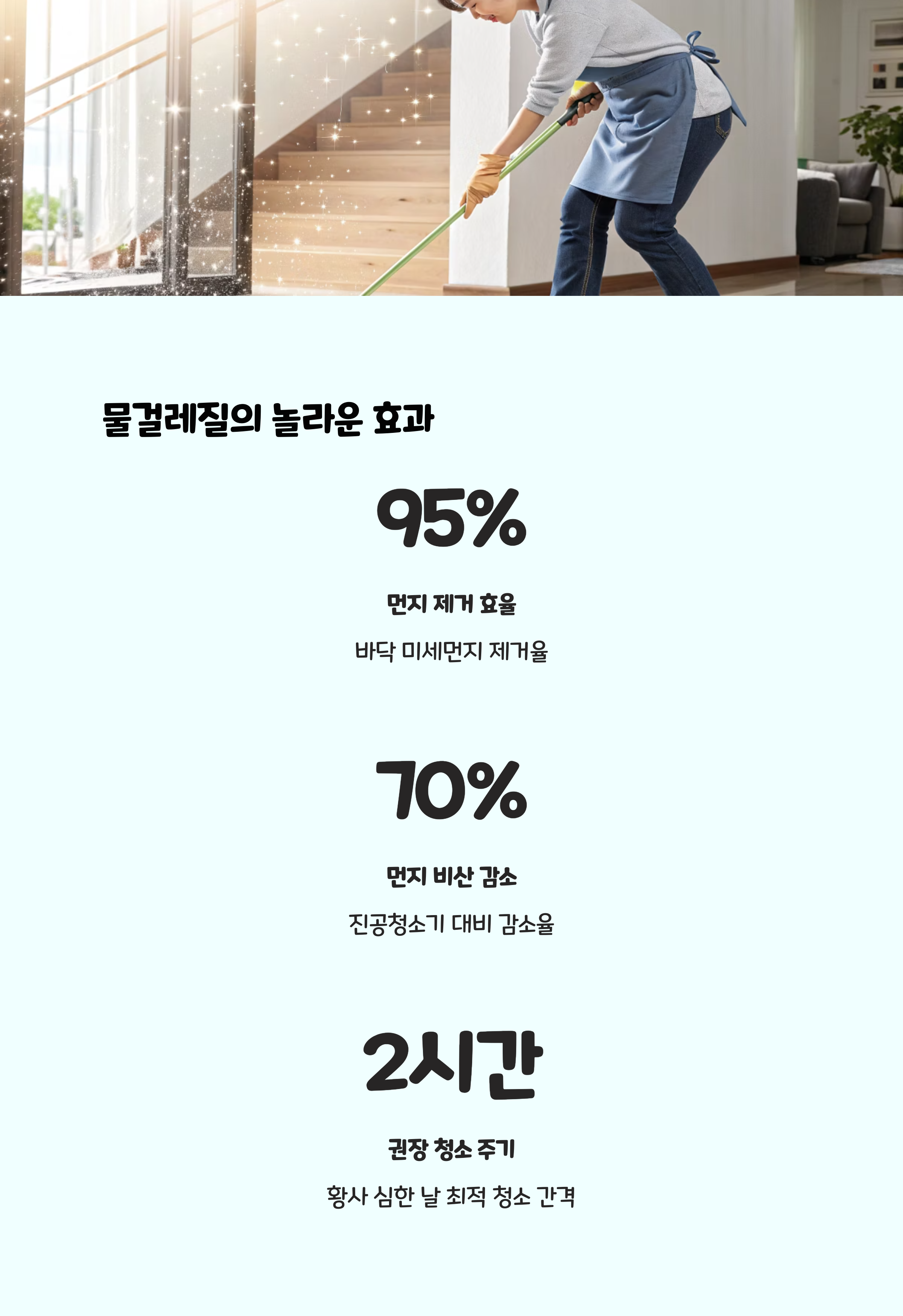 물걸레질을 통해 먼지를 제거하는 것이 가장 효과적이며, 진공청소기는 먼지를 다시 공기 중에 퍼뜨릴 수 있으니 주의해야 합니다. - 공기청정기 주변과 실내 가구 표면도 자주 닦아 청결을 유지하면 공기질 개선에 도움이 됩니다.