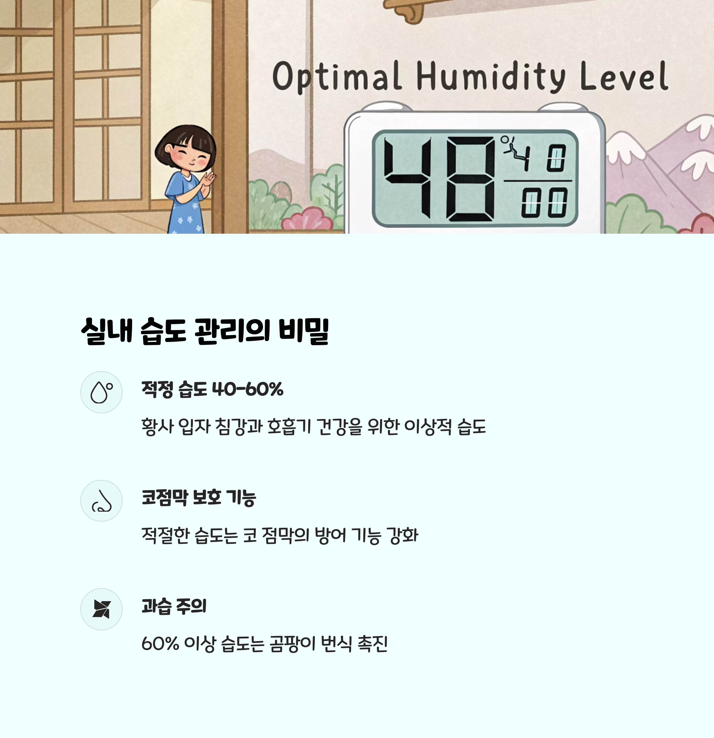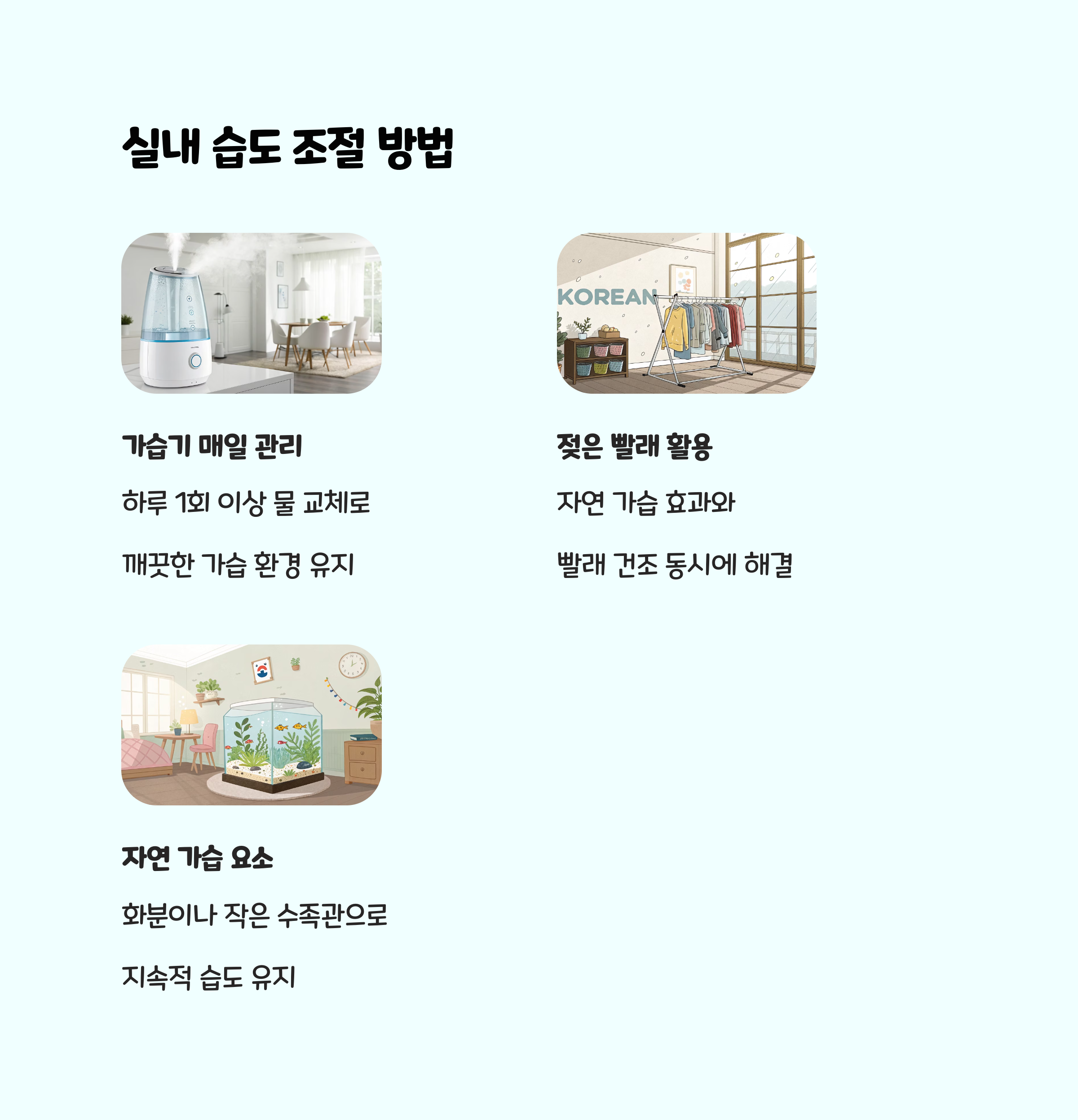 실내 습도를 40~60% 사이로 유지하면 먼지와 미세먼지가 공기 중에 덜 떠다니게 되어 공기 정화에 도움이 됩니다.- 가습기, 미니 분수대, 수족관, 공기정화 식물 등을 활용해 적정 습도를 유지하고, 아이가 충분히 수분을 섭취할 수 있도록 신경 써야 합니다.