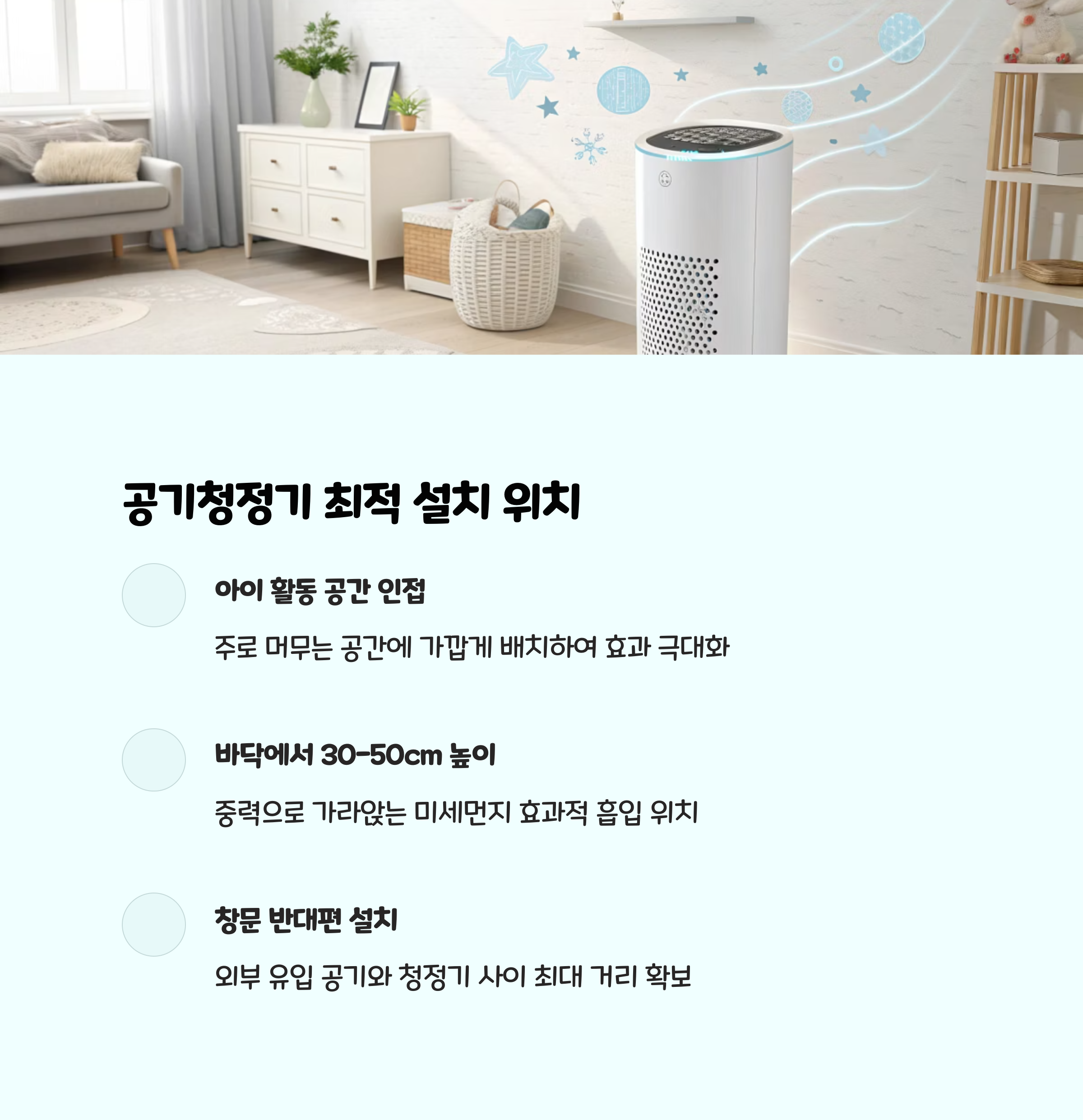 HEPA 필터가 장착된 공기청정기를 사용하는 것이 가장 효과적입니다.HEPA 필터는 초미세먼지(PM2.5)를 99% 이상 걸러내어 아이들이 숨 쉬는 공기를 깨끗하게 만들어 줍니다.- 공기청정기는 벽이나 가구에서 최소 50cm 이상 떨어뜨려 설치해 공기 흐름을 원활하게 해야 하며, 주변 청소도 자주 하여 필터 수명을 연장할 수 있습니다.