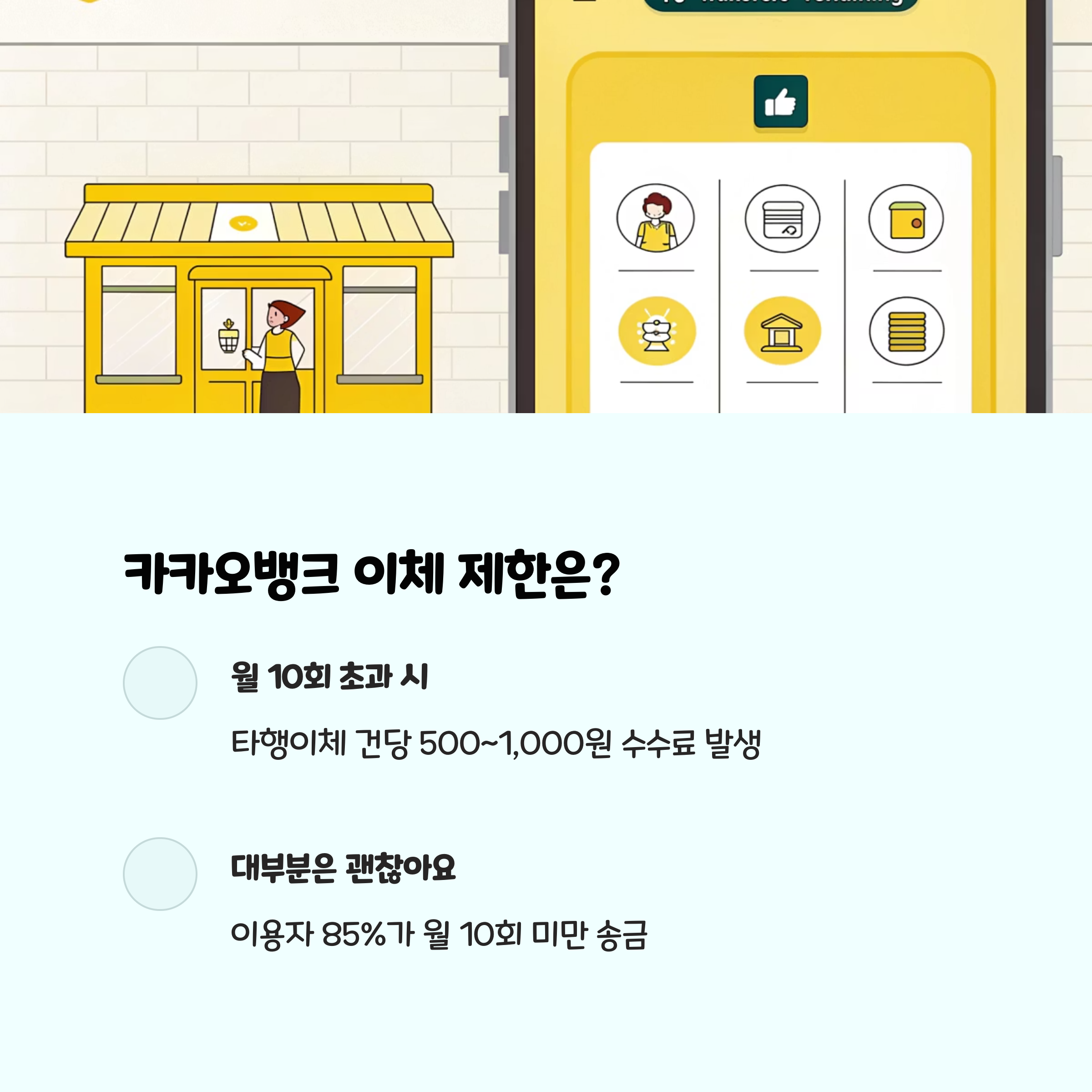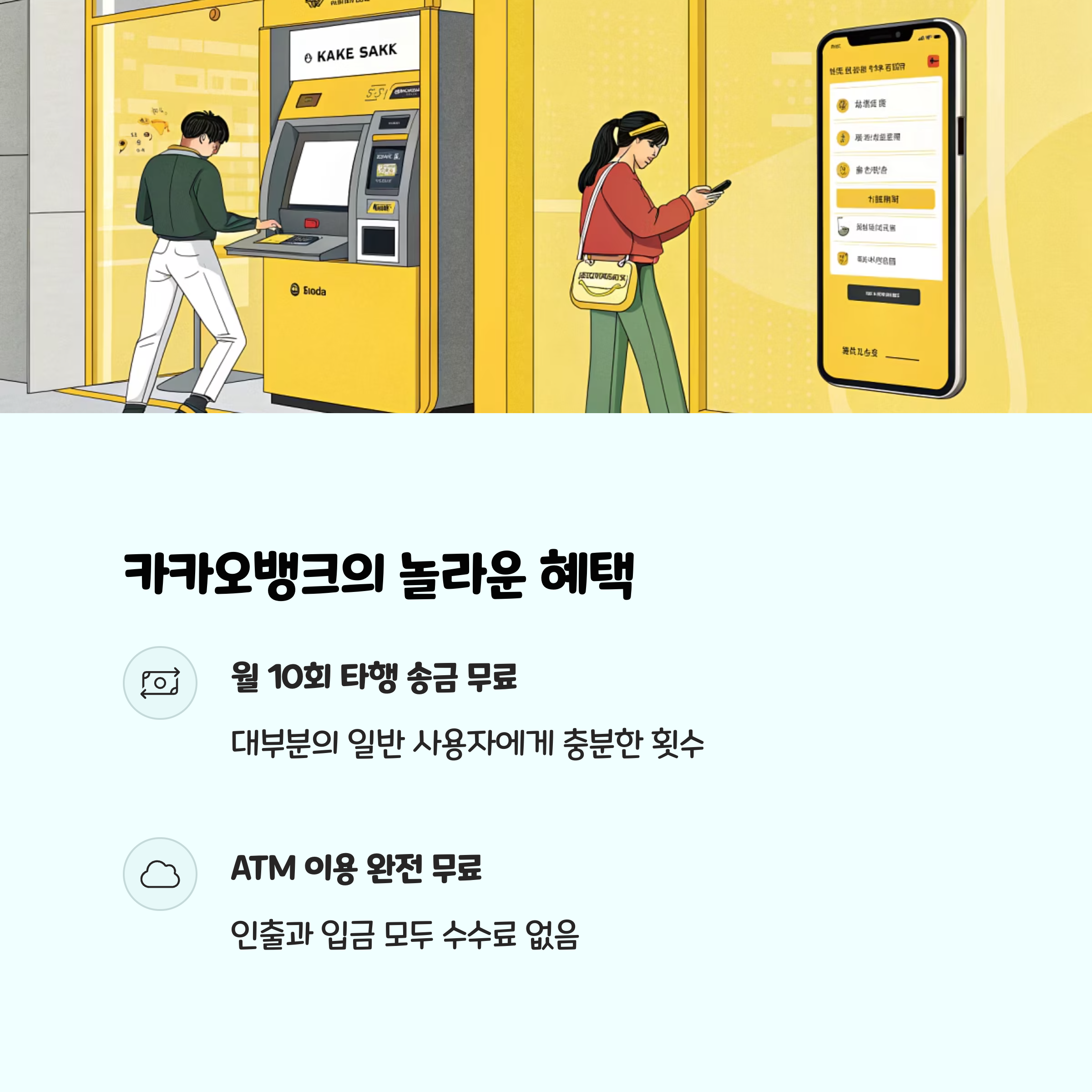 | 카카오뱅크 | 월 10회 무료 | 무제한 무료 | 체크카드 캐시백, 중도상환수수료 면제 |