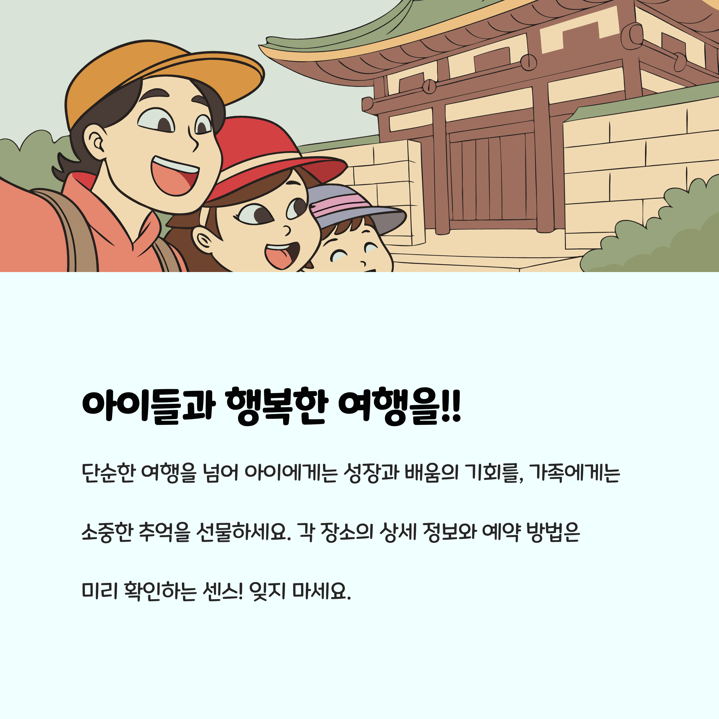 가족과 함께 떠나는 문화·역사 체험 여행은 아이들에게 단순한 관광이 아닌 살아있는 교육이자 감동의 시간이 됩니다. 2025년 여름방학, 위 추천 여행지 중 한 곳을 선택해 아이의 눈높이에 맞춘 다양한 체험과 함께 뜻깊은 추억을 만들어 보세요. 사전 예약과 체험 프로그램 일정 확인은 필수이며, 모두가 안전하고 즐거운 여행을 할 수 있길 바랍니다. 내일부터는 소개해드린 2025년 여름방학, 아이와 꼭 가봐야 할 문화·역사 체험 여행지 TOP 10을 한곳한곳 자세히 알아보도록 하겠습니다.