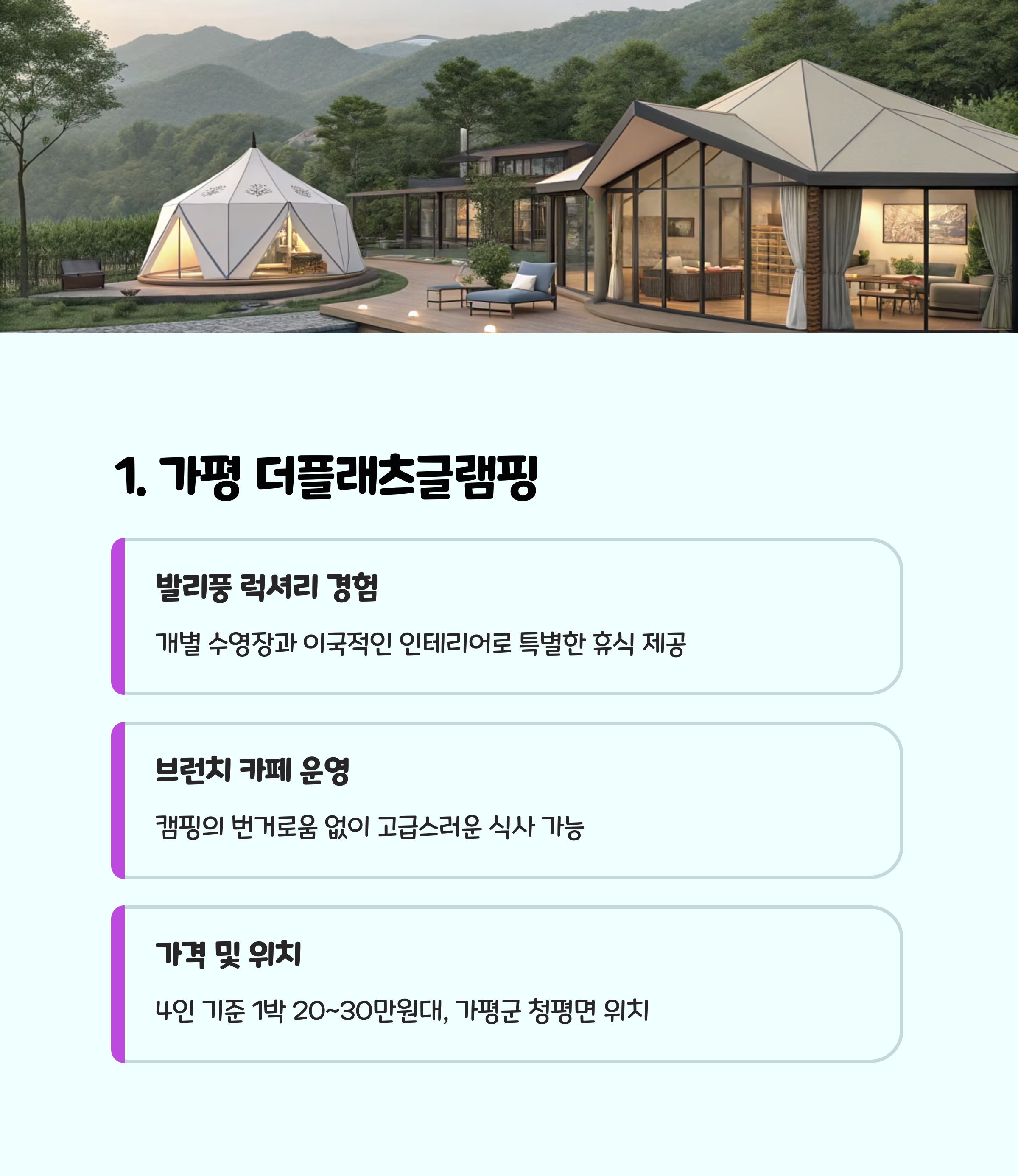 | 더플래츠글램핑 | 가평 | 발리풍 수영장, 브런치카페 | 25만~35만 원 |