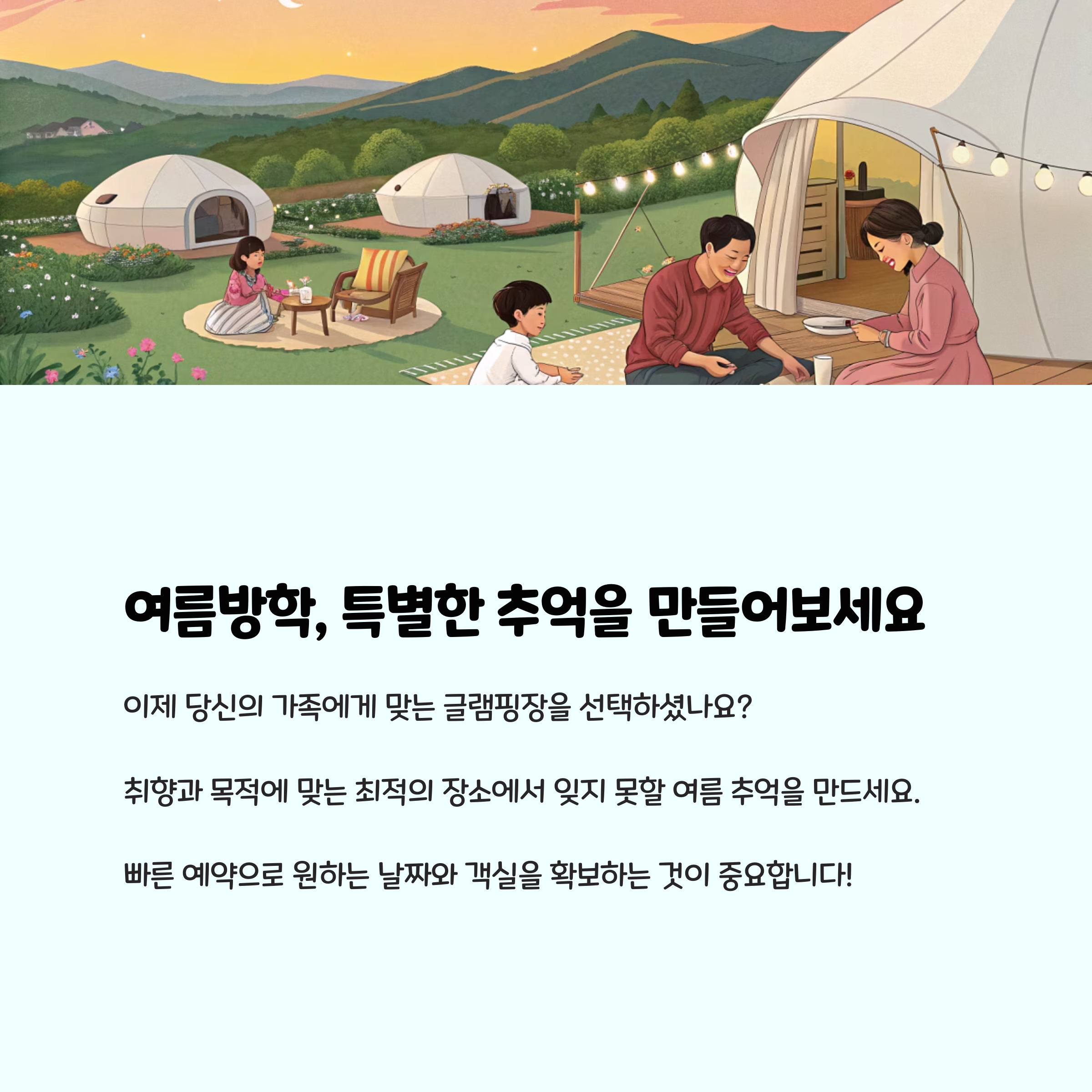 2025년 여름, 가족 모두가 만족할 글램핑장 선택은 미리 준비하는 것이 핵심입니다. 위에서 소개한 TOP 5 글램핑장은 최신 후기와 시설, 가격, 위치 등 여러 요소를 종합해 엄선했습니다. 가족의 취향과 여행 목적에 맞는 곳을 선택해, 올여름 소중한 추억을 만들어보세요. 예약은 서두를수록 원하는 날짜에 좋은 객실을 확보할 수 있습니다! 내일부터는 오늘 소개해드린 국내 가족 글램핑장 TOP 5를 한곳 한곳 자세히 알아보도록 하겠습니다.