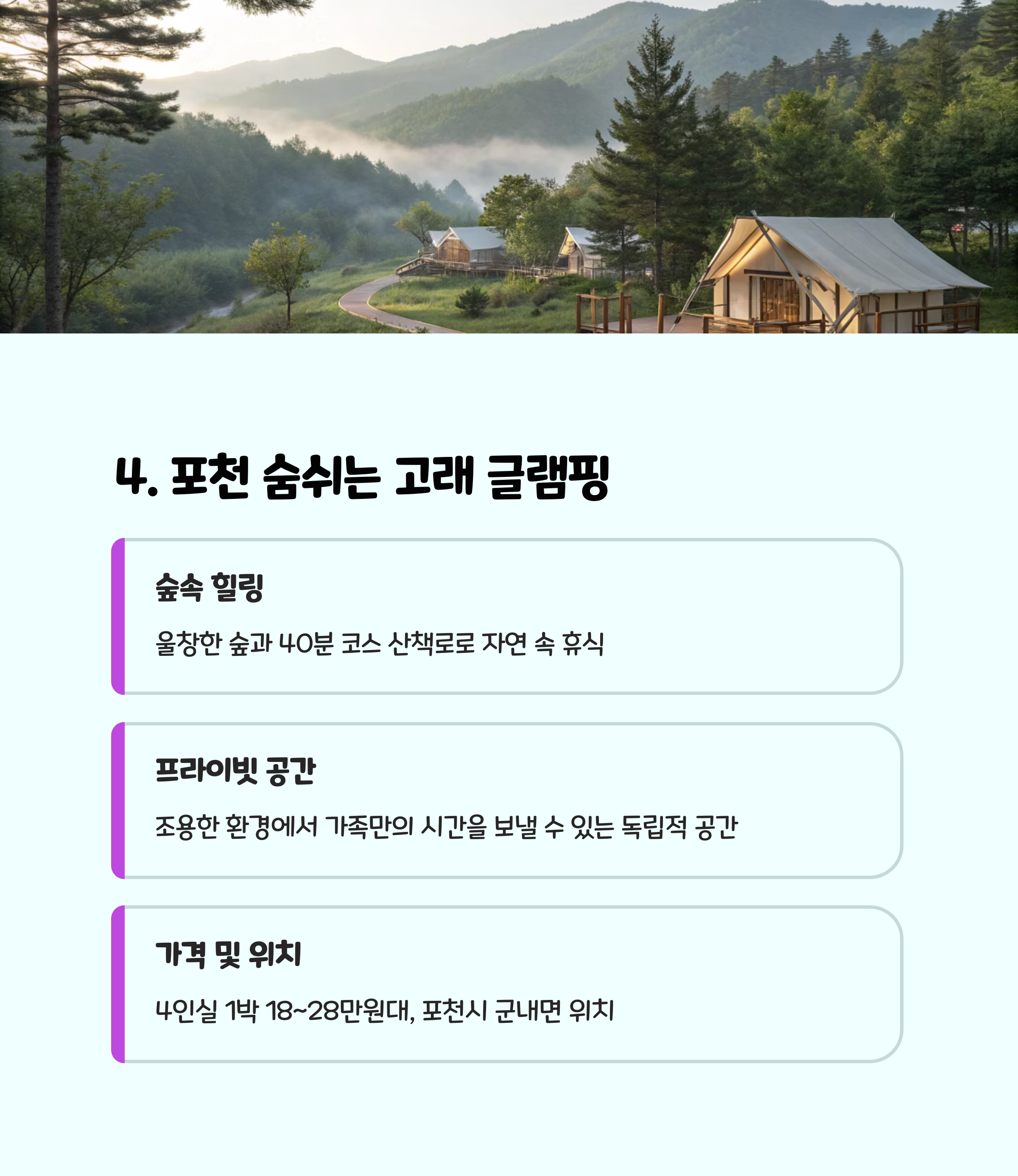 | 숨쉬는 고래 글램핑 | 포천 | 계곡, 숲속 힐링 | 15만~25만 원 |