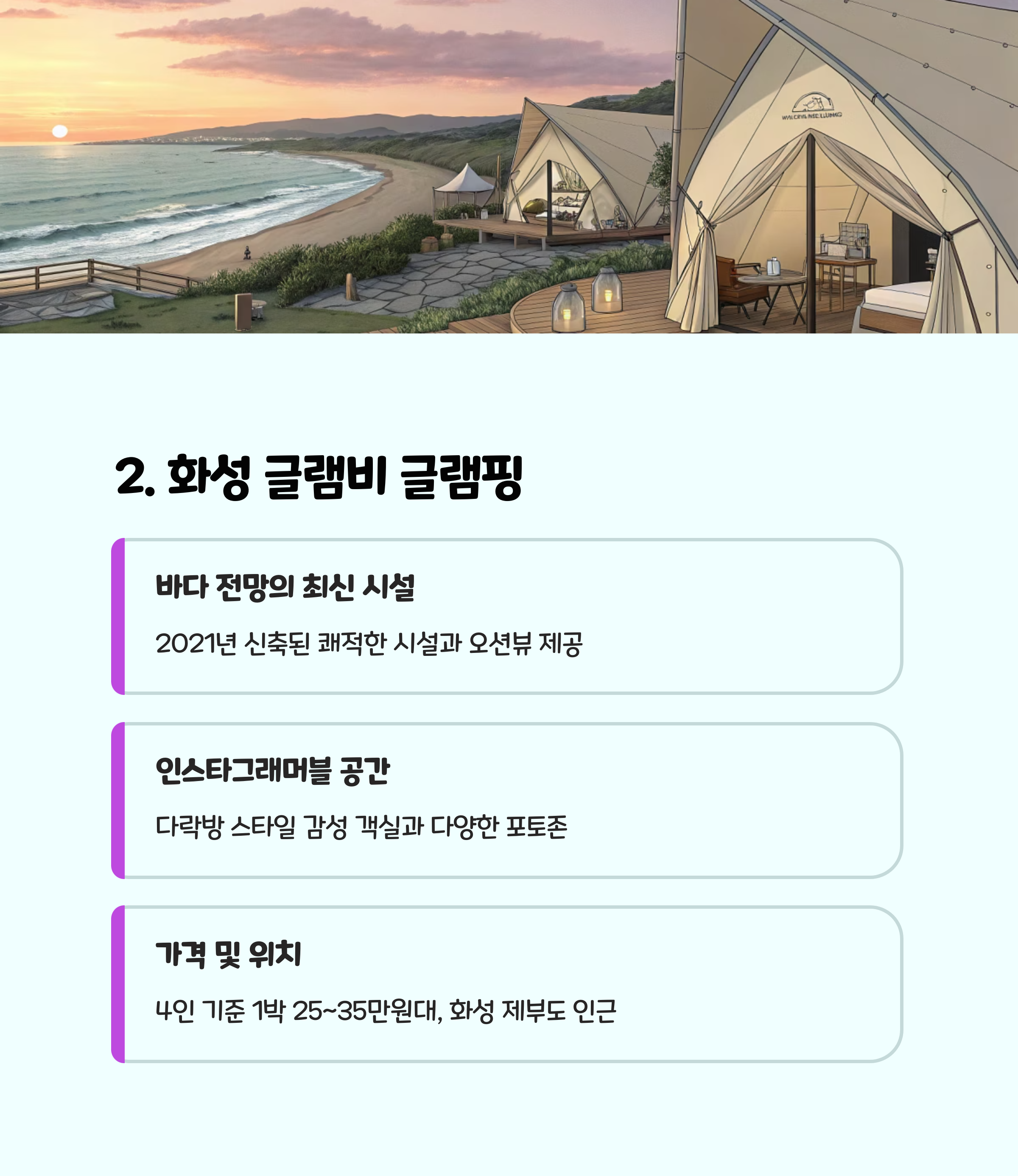 | 글램비 글램핑 | 화성 | 오션뷰, 신축, 포토존 | 10.7만~43.9만 원 |