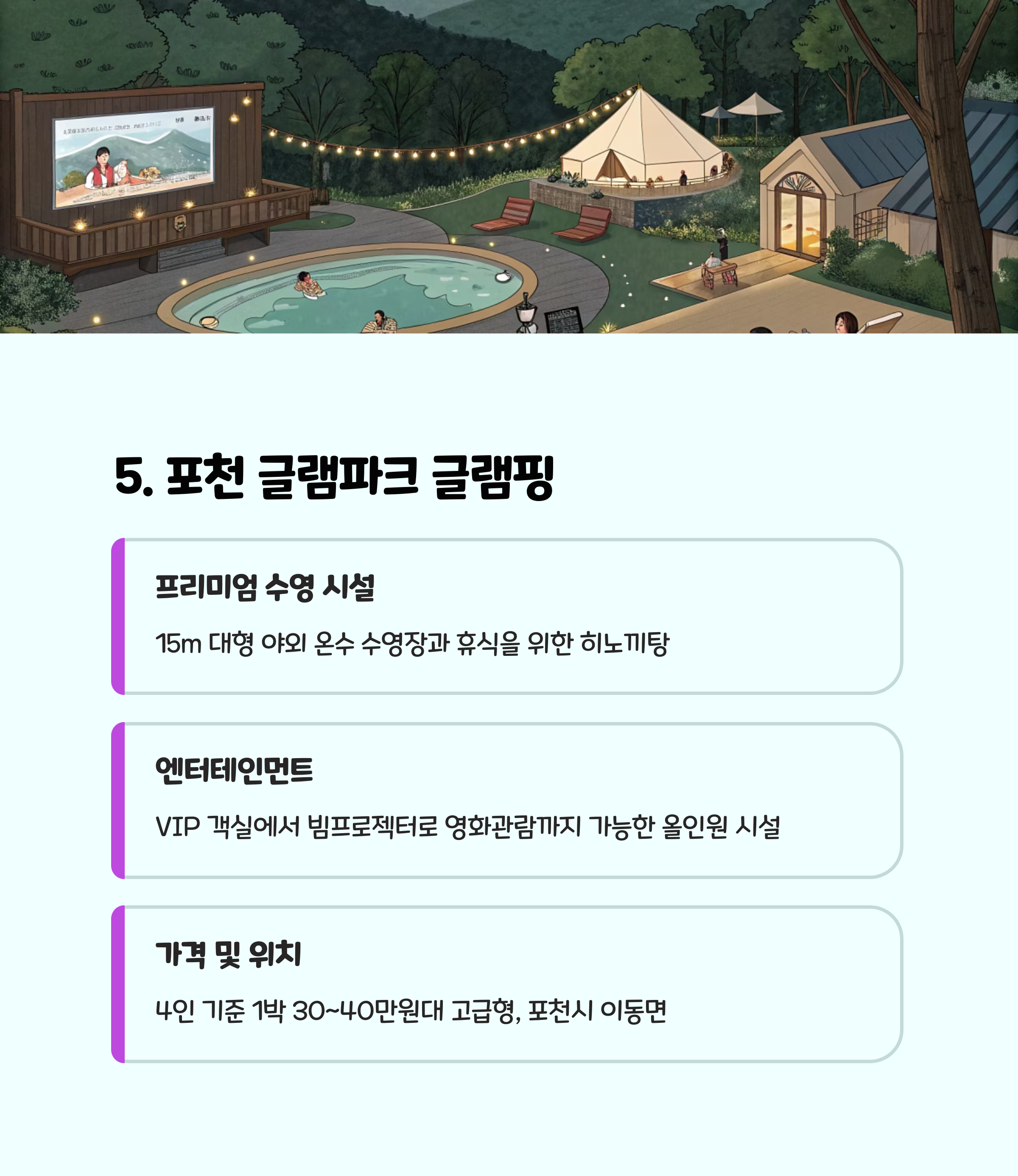 | 글램파크 글램핑 | 포천 | 온수수영장, 히노끼탕 | 22만~40만 원 |