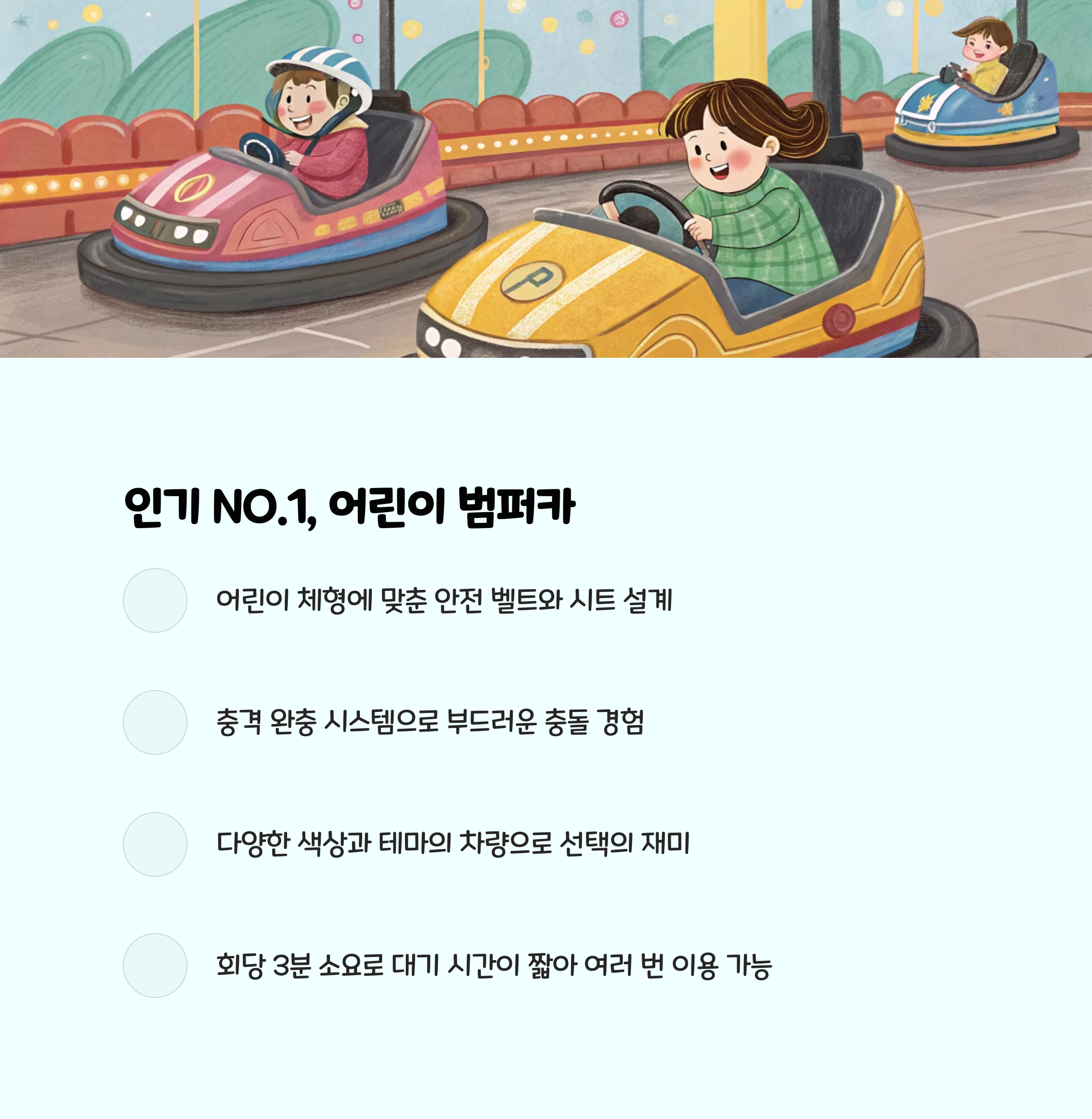 • 범퍼카 링고: 운전자 키 120cm 이상, 동승자 100~120cm, 최대 120kg까지 탑승 가능. 조이스틱으로 자유롭게 움직이며 포인트를 모으는 방식으로, 어린이와 보호자가 함께 즐기기 좋습니다.