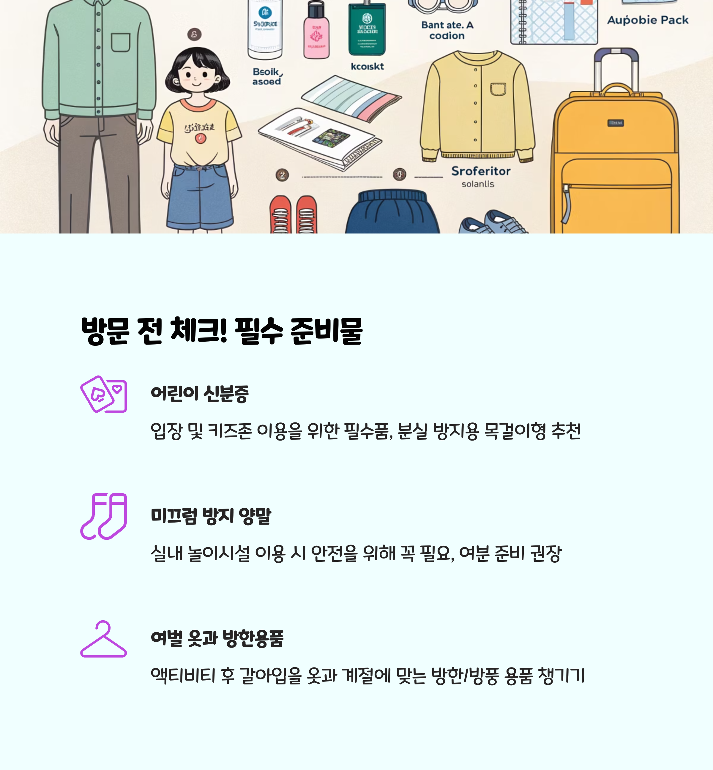 • 공통 준비물: 어린이 신분증(키 제한 확인용), 여벌 옷, 미끄럼 방지 양말(키즈존 내 필수), 간단한 간식, 휴대용 손소독제.