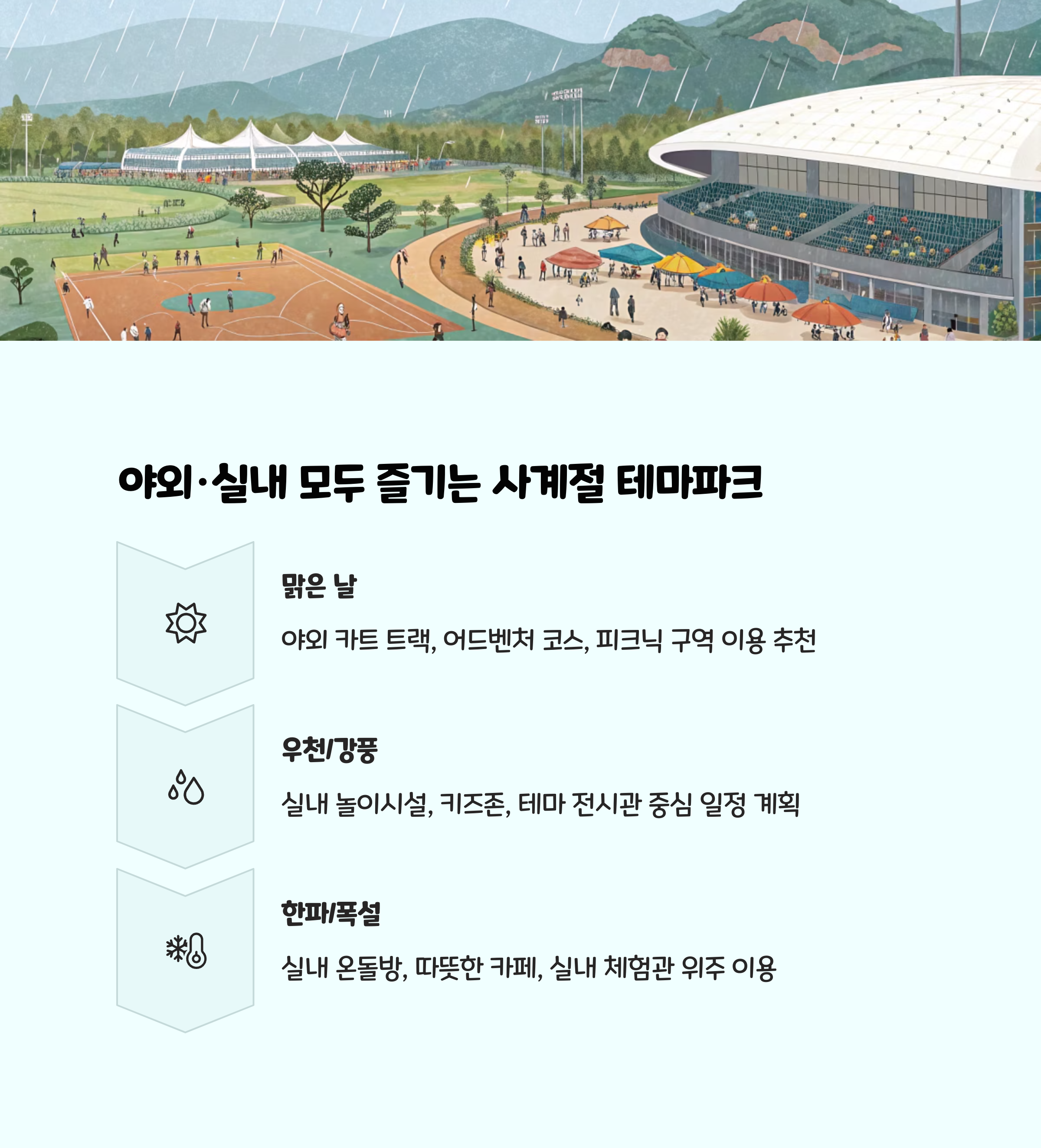 • 여름철 준비물: 자외선 차단제, 모자, 얇은 긴팔 옷, 물병(파크 내 정수기 이용 가능).