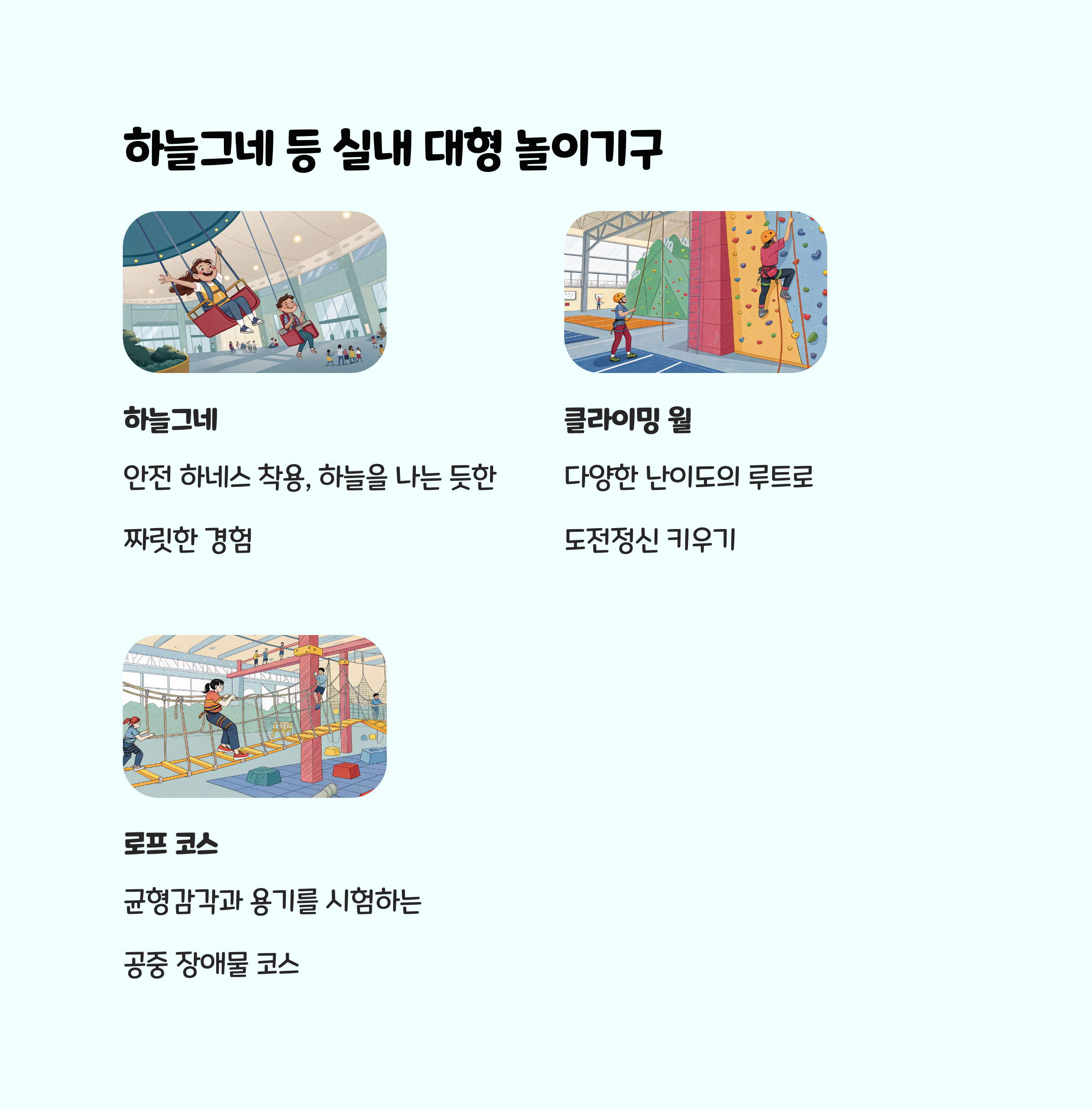 • 하늘그네(HEAL SWING): 360도 회전하는 세계 최초 익스트림 그네로, 짜릿한 스릴을 온몸으로 느낄 수 있습니다.