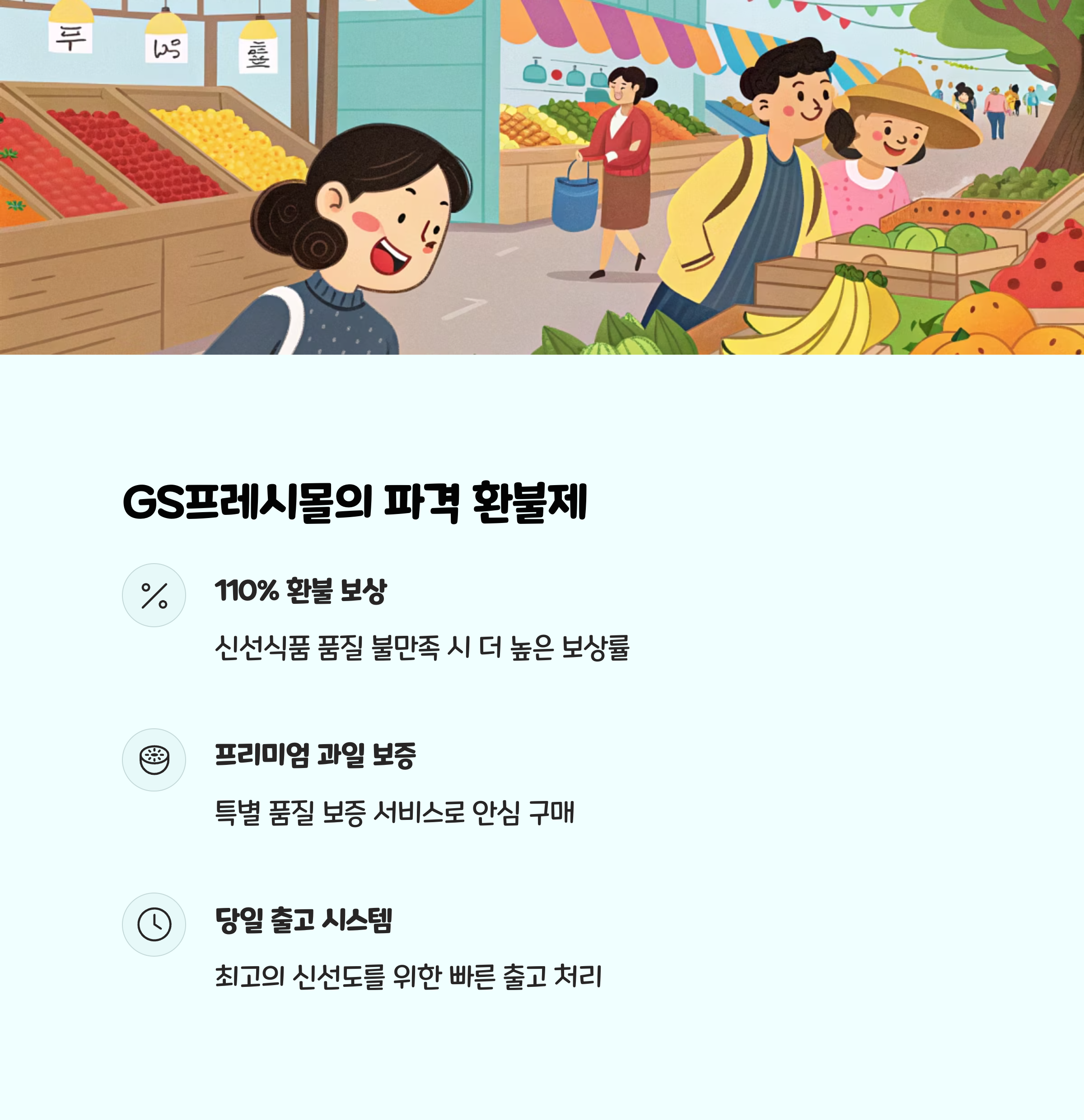 GS프레시몰 110% 환불제(신선특별시) 중저가 새벽배송, 전국 환불 시 구매가 10% 추가 지급, 품질관리 전문가 검수
