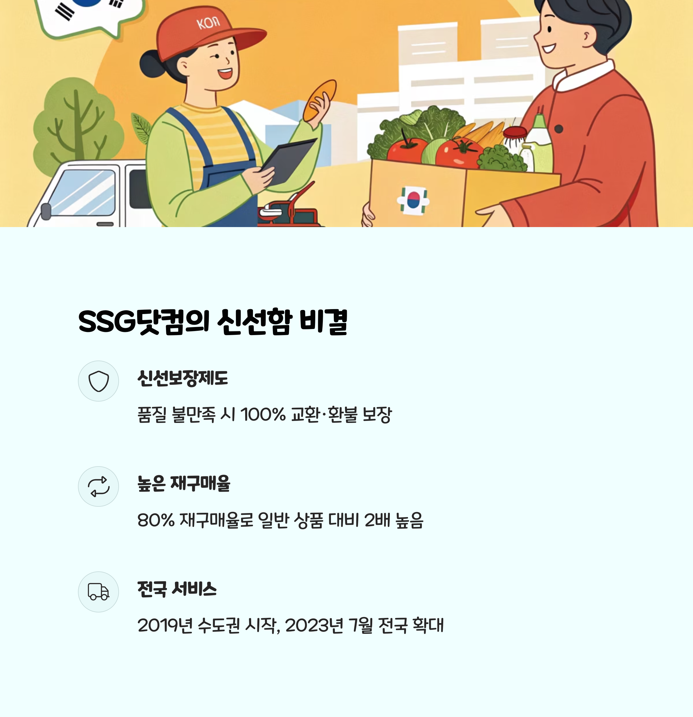 SSG닷컴 신선보장제(교환/환불), 전국 확대 중가 새벽배송, 시간대 지정 품질보장 상품 재구매율 80%, 포장·검수 엄격