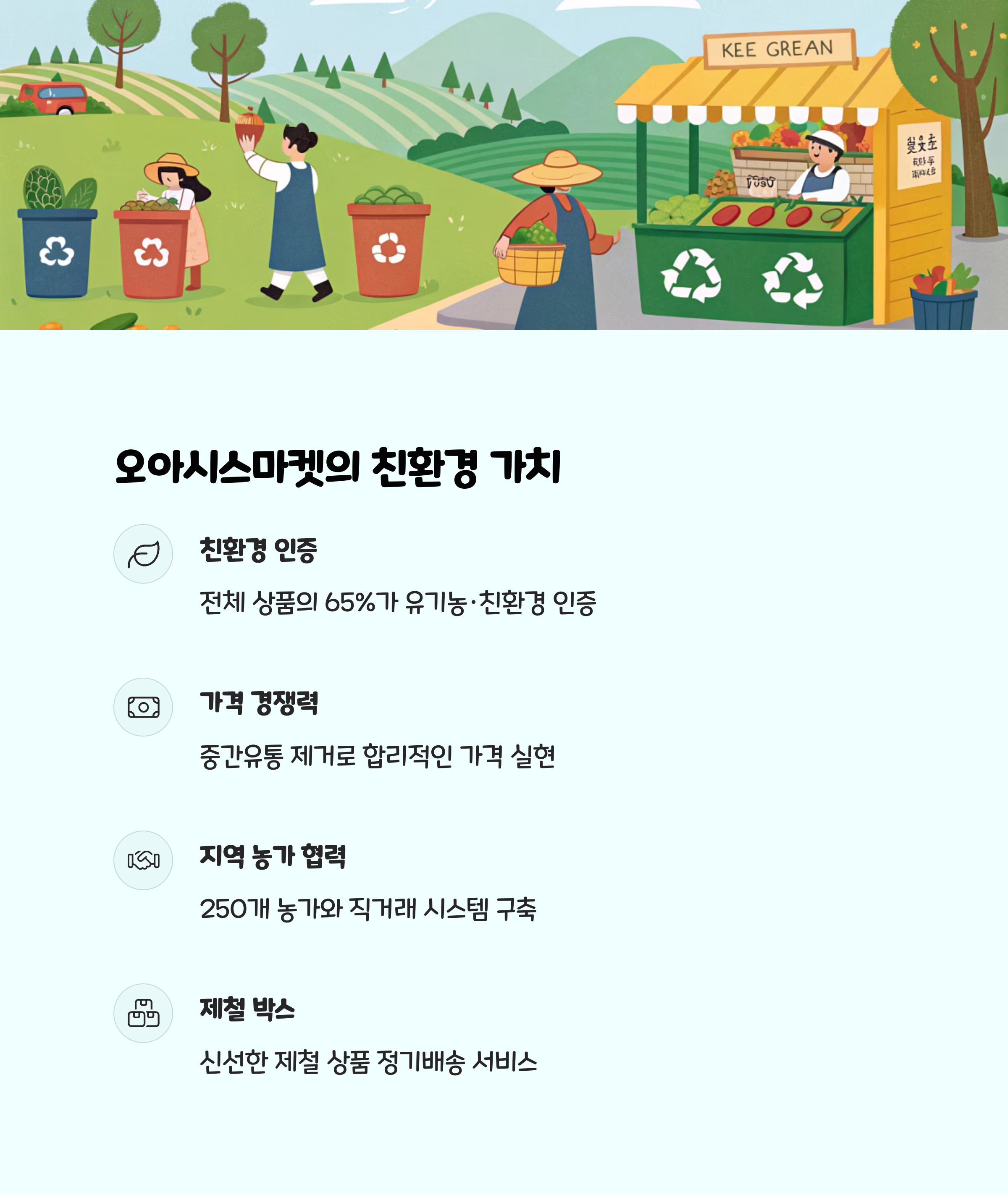 • 오아시스마켓과 헬로네이처는 친환경, 비건, 저염식 등 특정 식단에 특화된 신선식품을 주로 취급하며, 가격 경쟁력과 친환경 포장이 강점입니다.