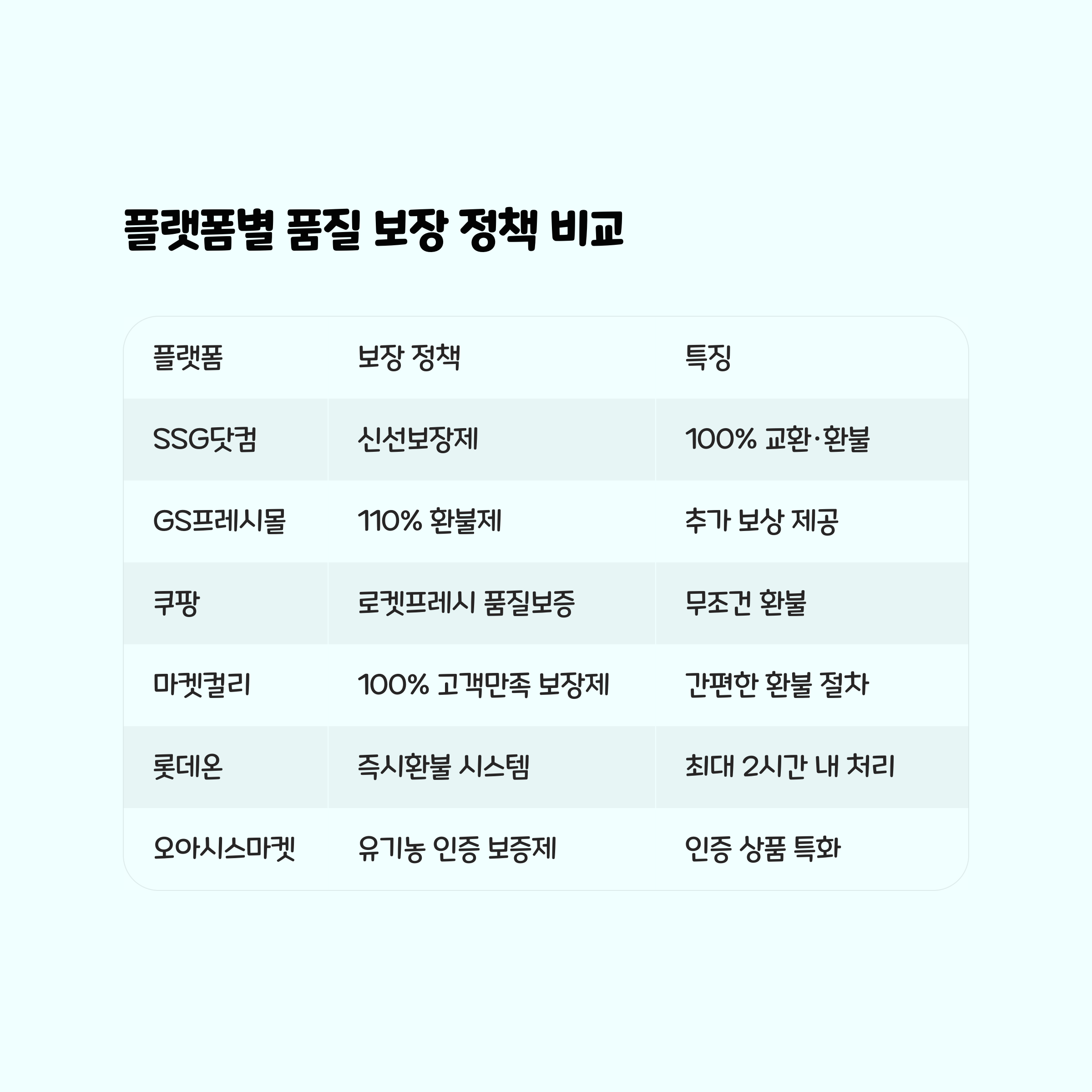 | 롯데온 | 초신선 보장(즉시 환불) | 중가 | 새벽배송, 전국 | 유통기한 정보 제공, 환불 절차 간편 |