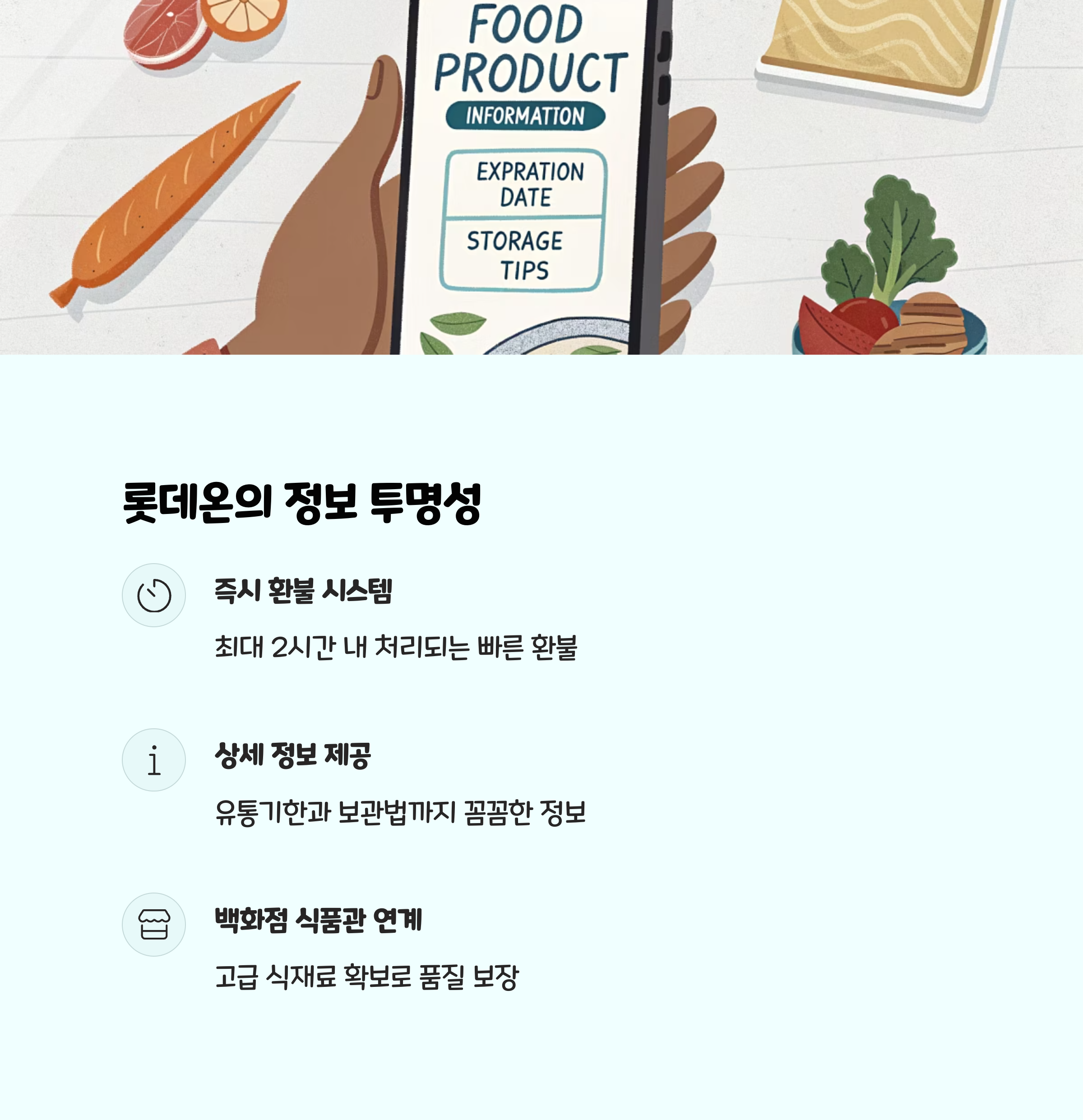 롯데온은 초신선 보장(즉시 환불)과 유통기한 정보 제공 등으로 신뢰를 얻고 있습니다. 신선식품에 대한 불만족 시 별도 회수 없이 바로 환불이 가능합니다.