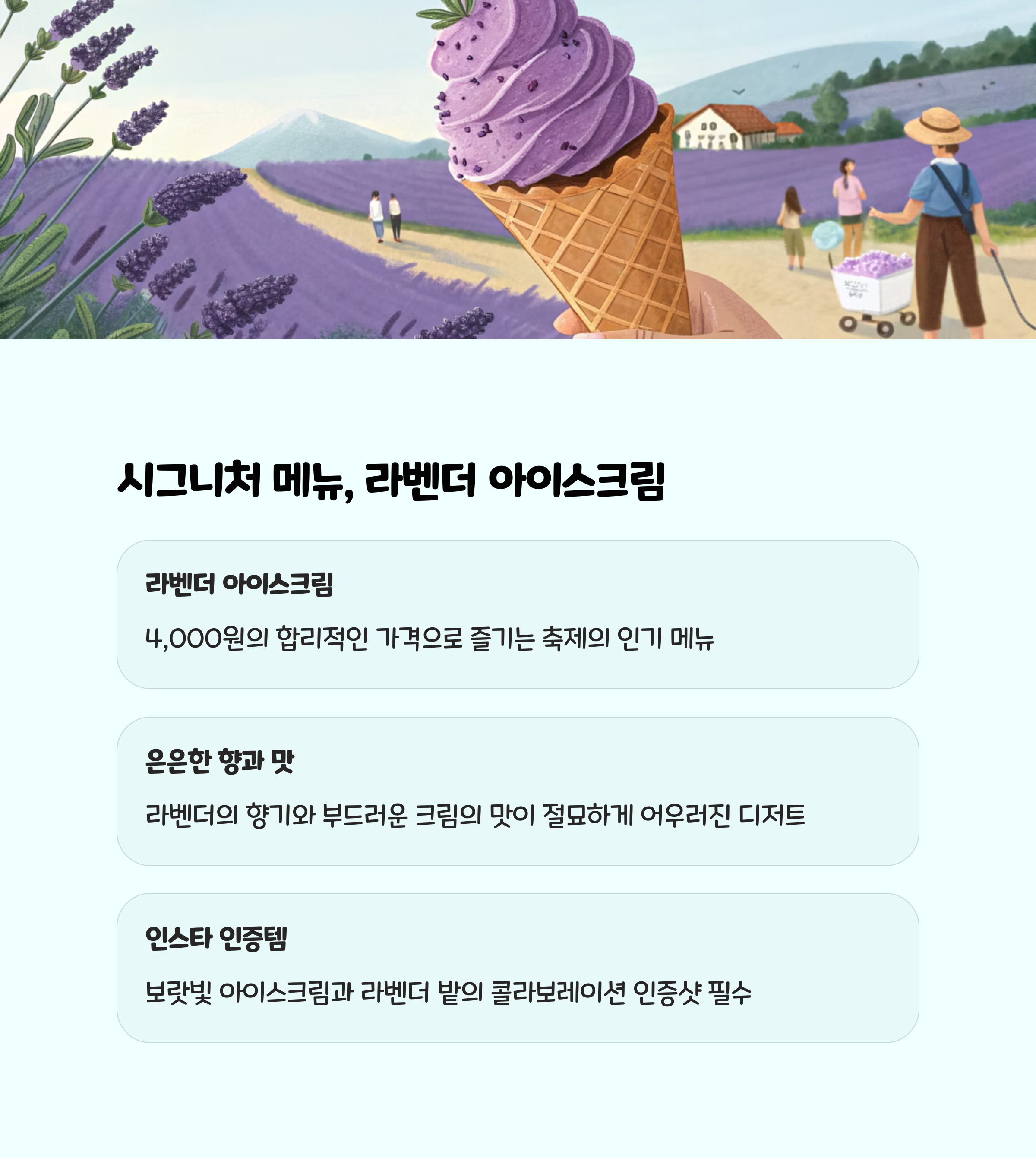 라벤더 정원 산책: 300평 규모의 라벤더 밭과 양귀비, 호밀밭, 수국, 메타세콰이어길 등 다양한 꽃길이 펼쳐집니다. 동화 속 풍경 같은 빈티지 정원과 이국적인 포토존이 곳곳에 있어 가족사진, 아이들의 인생샷을 남기기에 제격입니다.향기 체험 클래스: 남녀노소 누구나 참여할 수 있는 라벤더 향주머니 만들기, 아로마 스프레이 만들기, 라벤더 심어가기 등 다양한 공예 체험이 준비되어 있습니다. 각 체험은 5,000원으로, 아이와 함께 직접 만들어볼 수 있어 교육적이면서도 재미있습니다.향기 음악회 & 라벤더 이야기: 축제 기간 중에는 원니스밴드, 고성필하모니오케스트라 등 다양한 공연이 열리고, 라벤더 향수 추출 시연, 라벤더 재배법 강의 등도 진행되어 가족 모두가 새로운 경험을 할 수 있습니다.이벤트와 즐길거리: 슬리퍼 날리기 대회(매주 일요일 오후 3시), 포토 콘테스트(6월 30일까지), 라벤더 향주머니 던지기 등 아이들이 즐길 수 있는 이벤트도 풍성합니다. 라벤더 아이스크림(4,000원)도 꼭 맛보세요. 특유의 향과 색감이 무더위를 잊게 해줍니다.