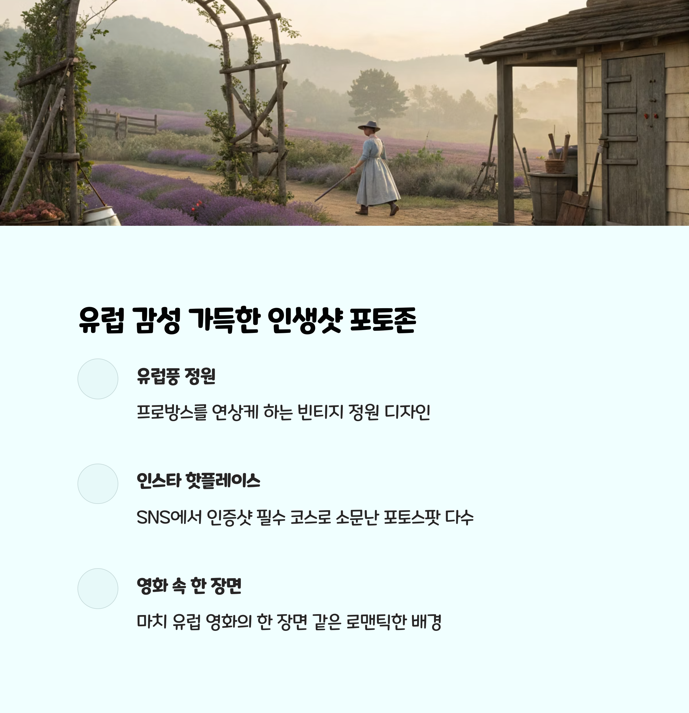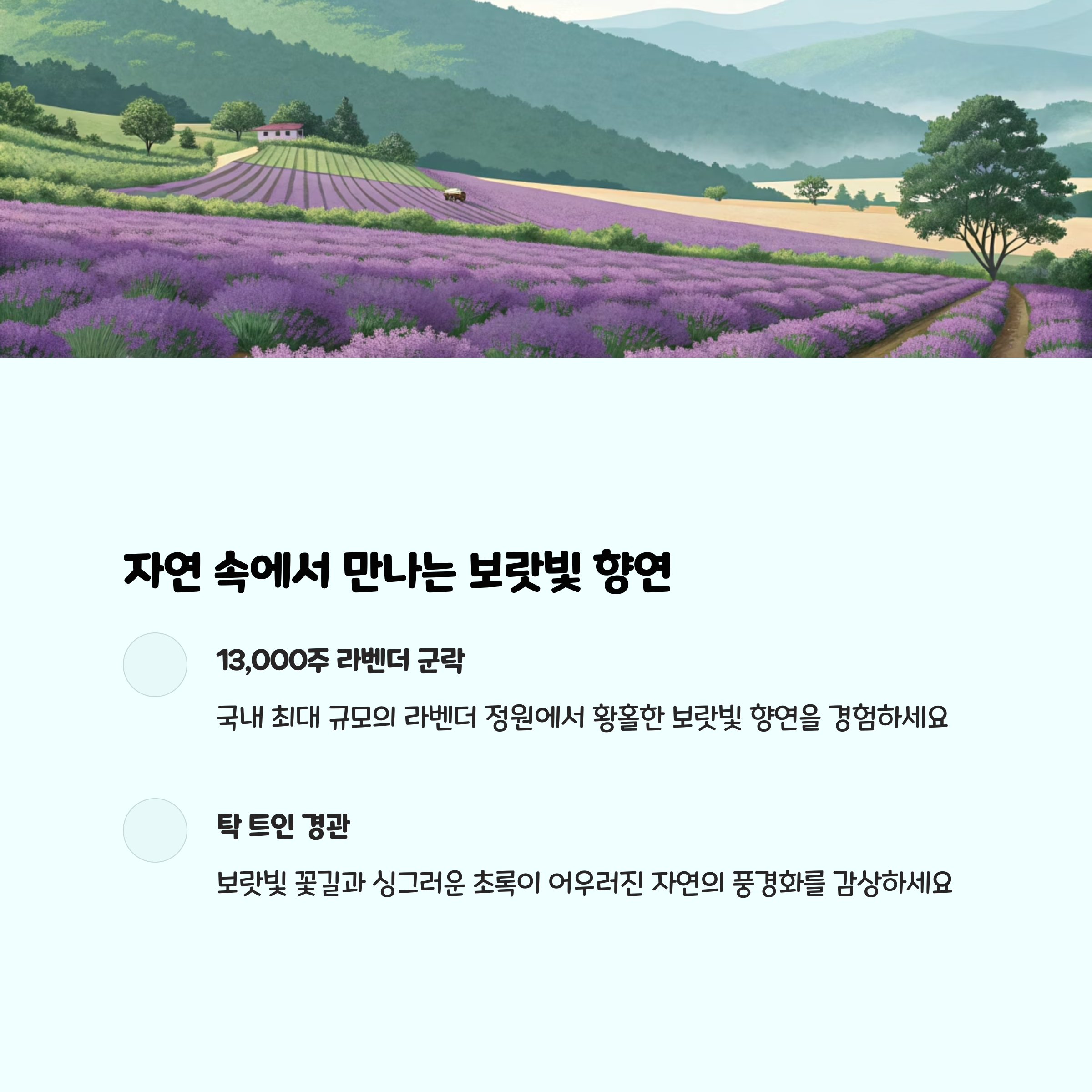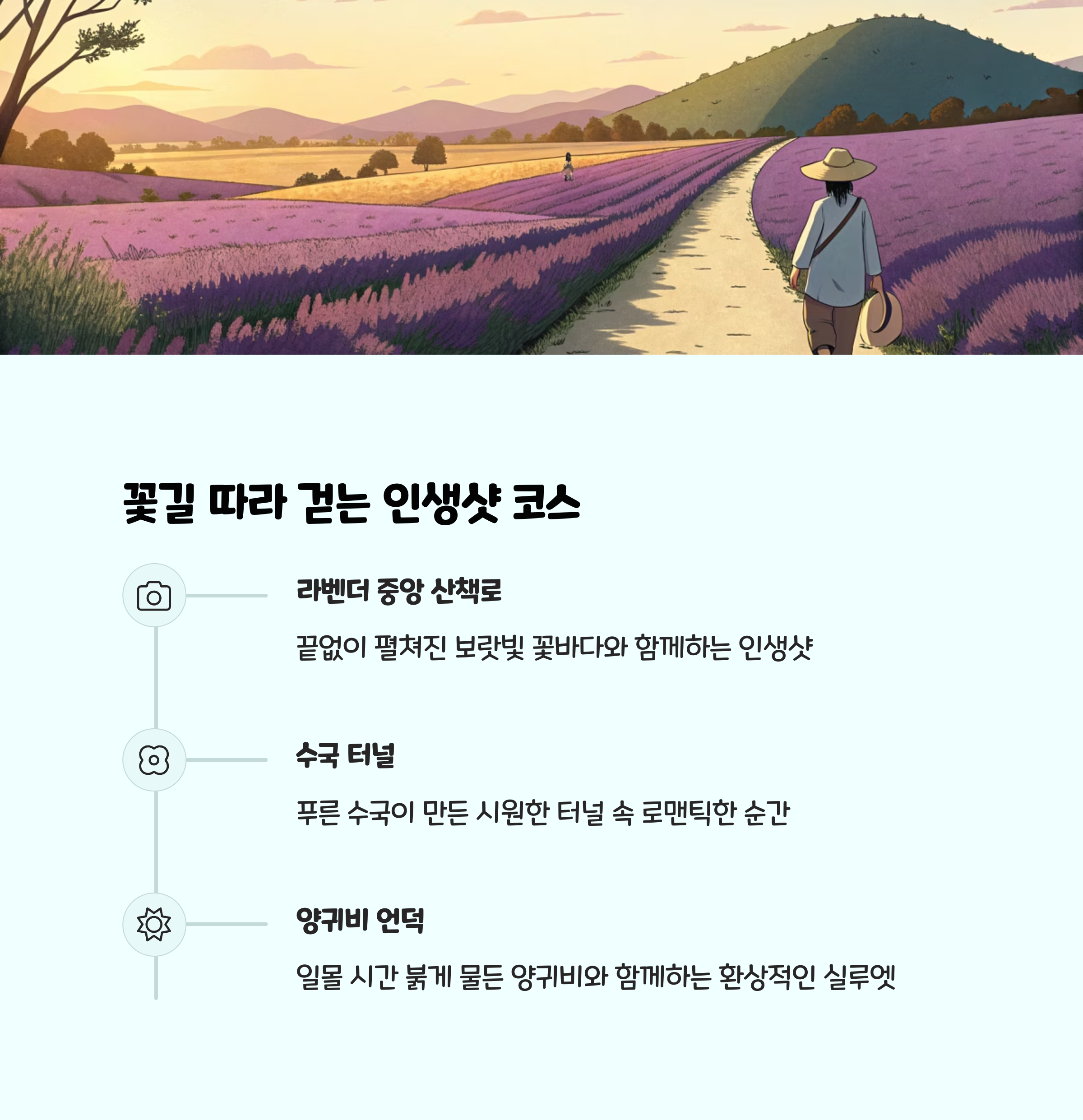 라벤더 밭을 중심으로 양귀비, 호밀밭, 수국, 샤스타데이지 등 다양한 꽃길을 산책하며 자연의 아름다움을 만끽할 수 있습니다. 중간중간 그늘 공간이 있어 쉬어가기에도 좋습니다.