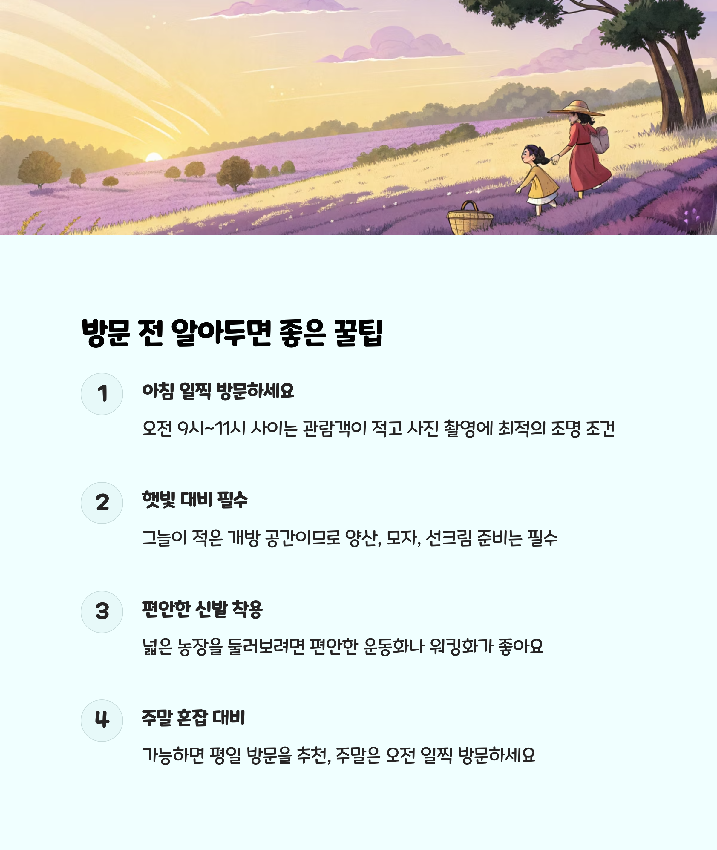 본 내용은 대한민국 공식 관광 정보 사이트 ‘대한민국 구석구석’과 하늬라벤더팜 공식 홈페이지, 그리고 국내 여행 전문 매체의 공식 자료와 최근 기사 내용을 종합하여 정리한 것입니다. 축제 일정, 입장료, 체험 등은 모두 해당 기관의 공식 발표를 참고했습니다.