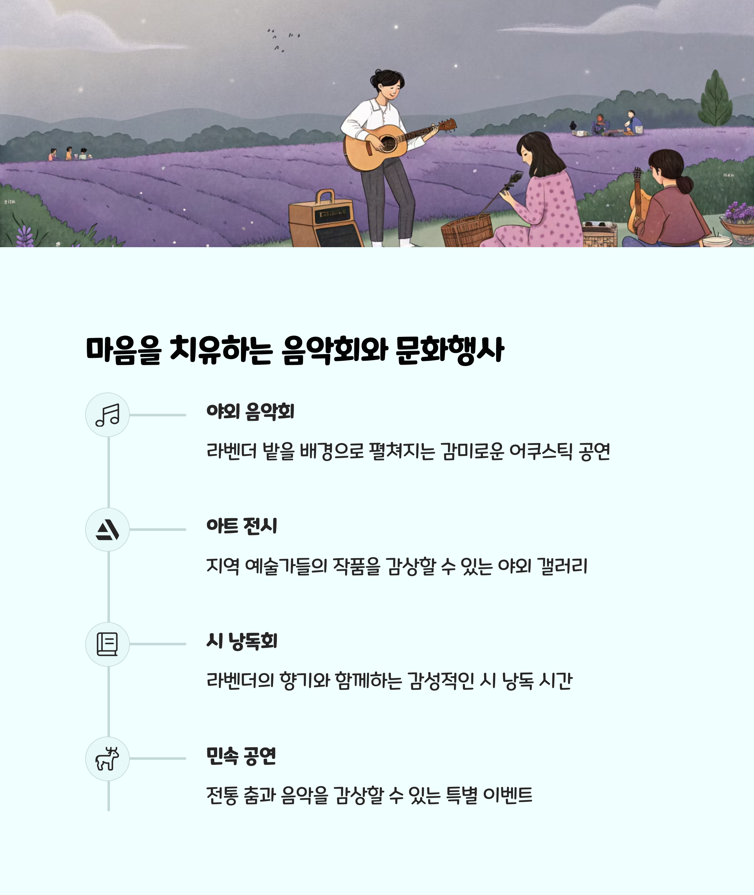 공연 시간에 맞춰 음악회나 라벤더 관련 강의를 듣는 것도 추천합니다. 자연 속에서 듣는 음악은 특별한 감동을 선사합니다.
