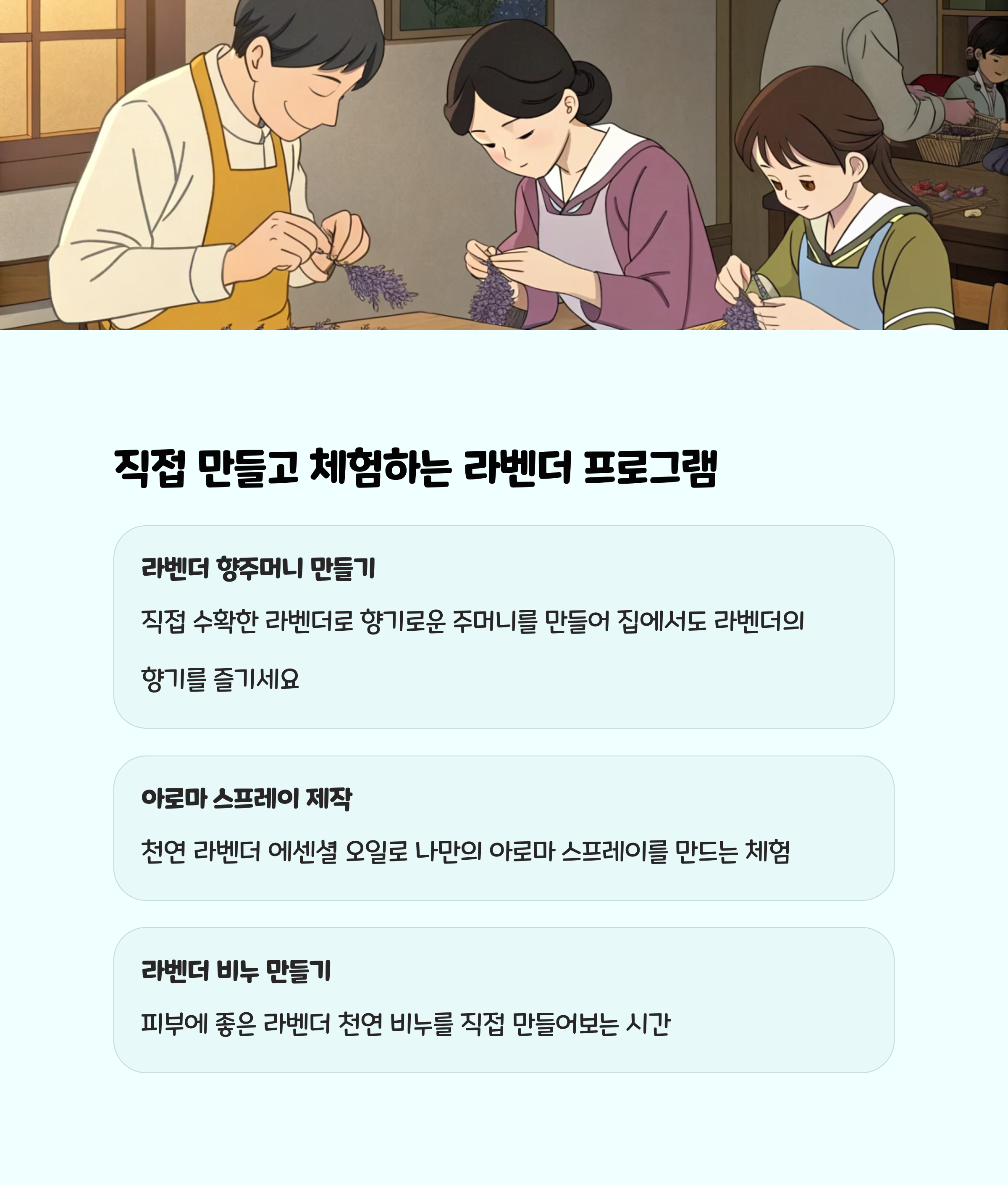 가족 단위 방문객을 위한 체험으로 라벤더 향주머니 만들기, 아로마 스프레이 만들기, 라벤더 심기 등이 있습니다. 각 체험은 약 5,000원의 참가비로 진행되며, 아이들과 함께 직접 만들고 배울 수 있어 교육적이고 재미있는 시간을 보낼 수 있습니다.