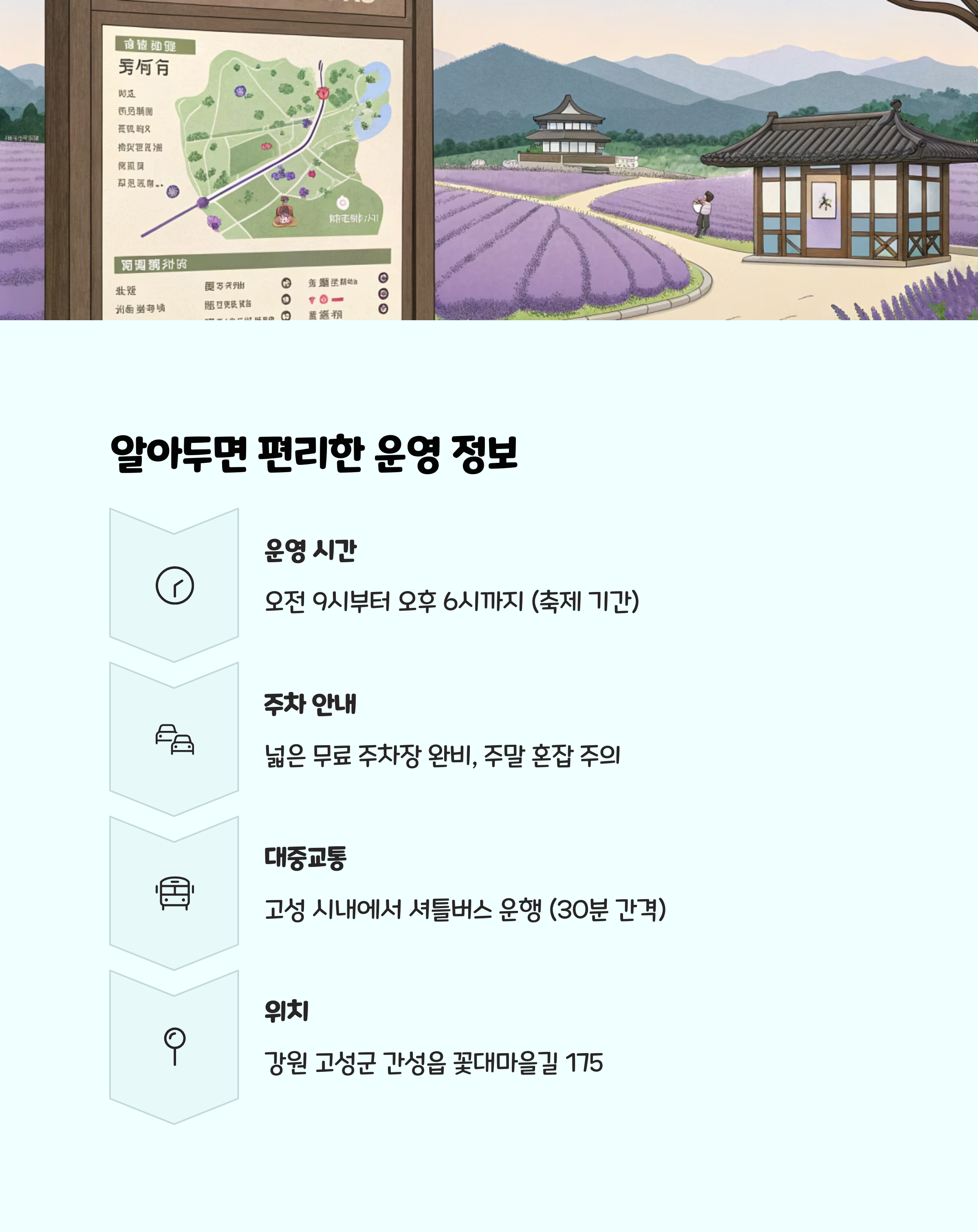 운영시간: 6월 5일~6월 25일 09:00~19:00 (주말 연장 운영, 입장 마감 18:00)위치: 강원특별자치도 고성군 간성읍 꽃대마을길 175 (하늬라벤더팜)입장료: 성인 6,000원, 중고생 5,000원, 초등생 3,000원, 유아 2,000원 (단체 20인 이상 20% 할인)주차: 넉넉한 주차 공간 완비유의사항: 반려동물 동반 금지, 외부 음식 반입 금지, 드론 촬영 금지. 모자, 양산 등 햇빛 차단 용품 준비 권장.