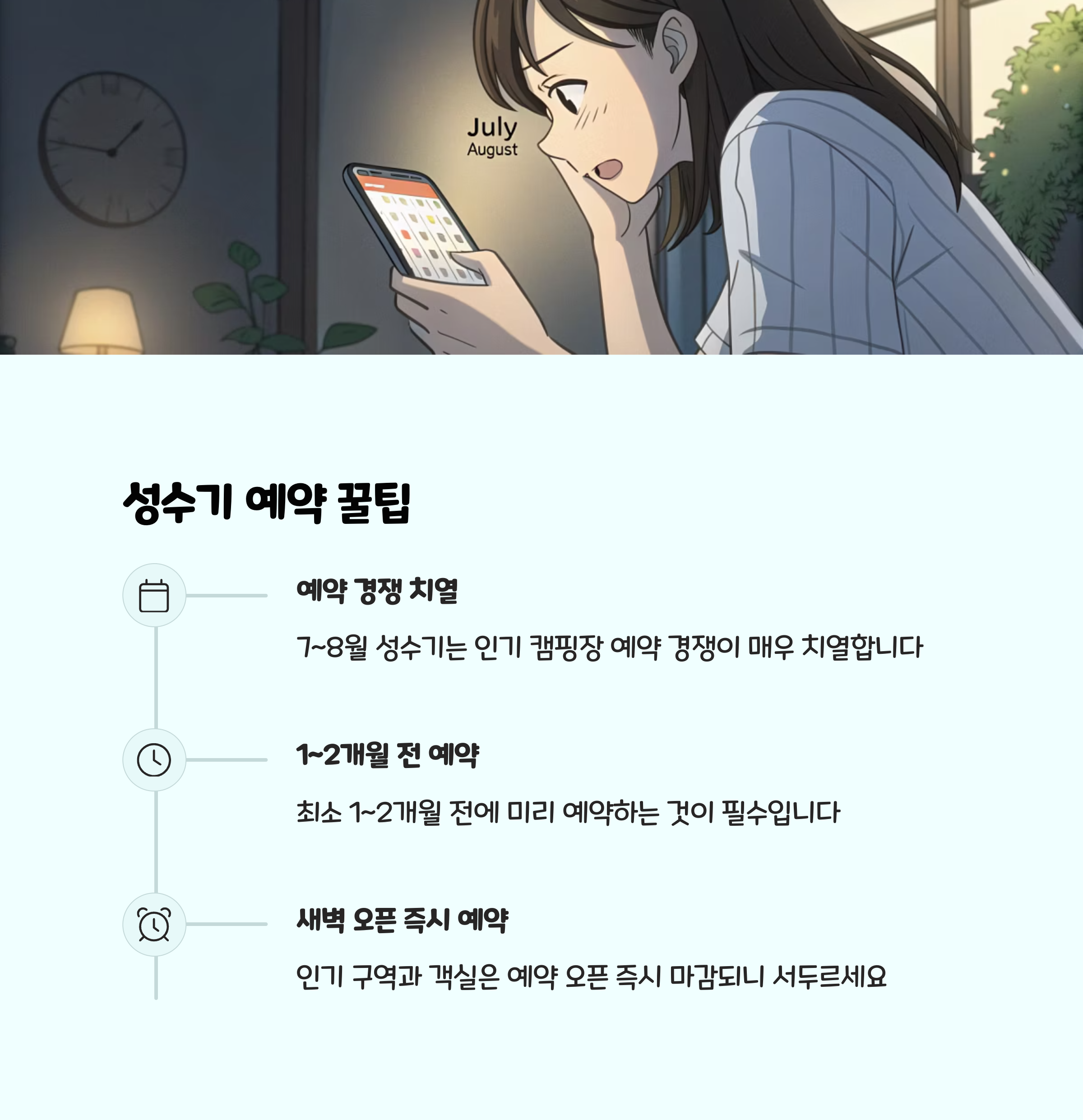 6월은 캠핑 성수기로 인기 캠핑장과 글램핑장은 예약 경쟁이 매우 치열합니다. 특히 주말이나 연휴는 1~2개월 전부터 예약이 마감되는 경우가 많으므로, 최소 한 달 전에는 예약을 완료하는 것이 좋습니다. 미리 계획을 세우고 예약 일정 오픈일을 확인해 두면 원하는 날짜에 방문할 확률이 높아집니다.