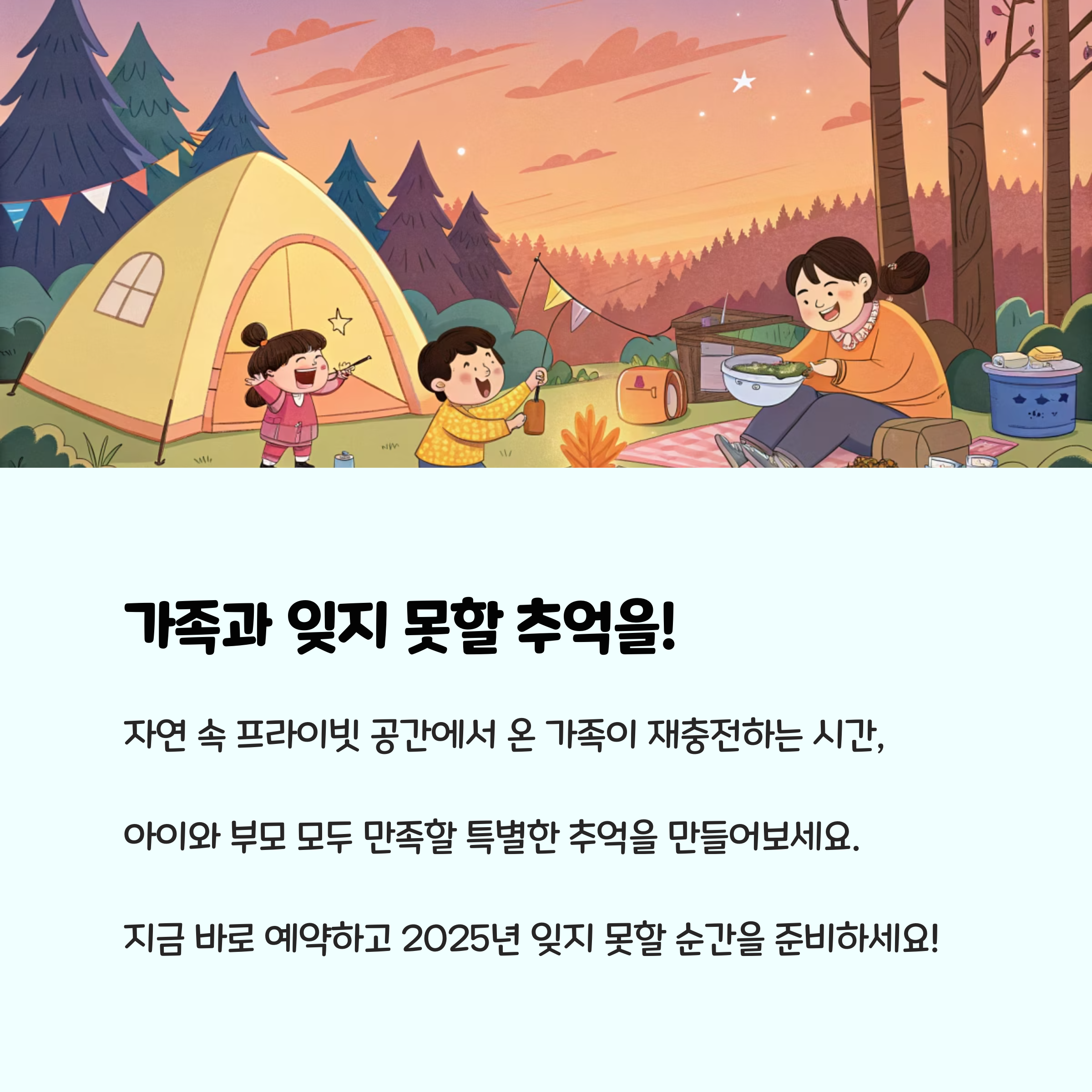 2025년 6월, 가족 모두가 만족할 수 있는 자연 속 힐링 캠핑장과 글램핑장을 미리 예약해보세요. 울창한 숲, 맑은 계곡, 프라이빗한 공간, 다양한 체험 프로그램이 어우러진 이곳들에서, 가족과 함께 특별한 추억을 만들어보시길 바랍니다. 성수기 예약 경쟁이 매우 치열하니, 마음에 드는 곳이 있다면 지금 바로 예약 일정을 체크해 보세요!