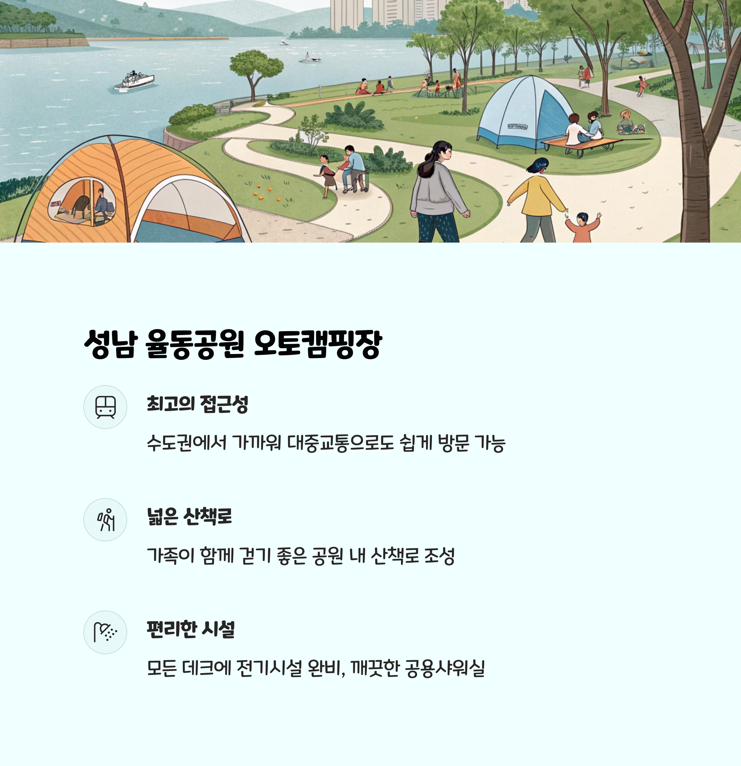 2025년 6월 새롭게 오픈한 성남 율동공원 오토캠핑장은 도심에서 도보로도 접근 가능한 자연친화적 공공캠핑장입니다. 총 96면 중 텐트가 설치된 사이트는 14면, 이 중 6월 14일 토요일 예약에는 2,431명이 몰려 무려 270:1의 경쟁률을 기록할 만큼 인기가 폭발적입니다. 잔디마당, 숲 놀이터, 숲 체험 공간, 반려견 놀이터 등 다양한 부대시설이 있어 가족 모두가 즐길 수 있습니다. 예약은 성남시민 우선, 이후 일반 예약이 진행되니 참고하세요.