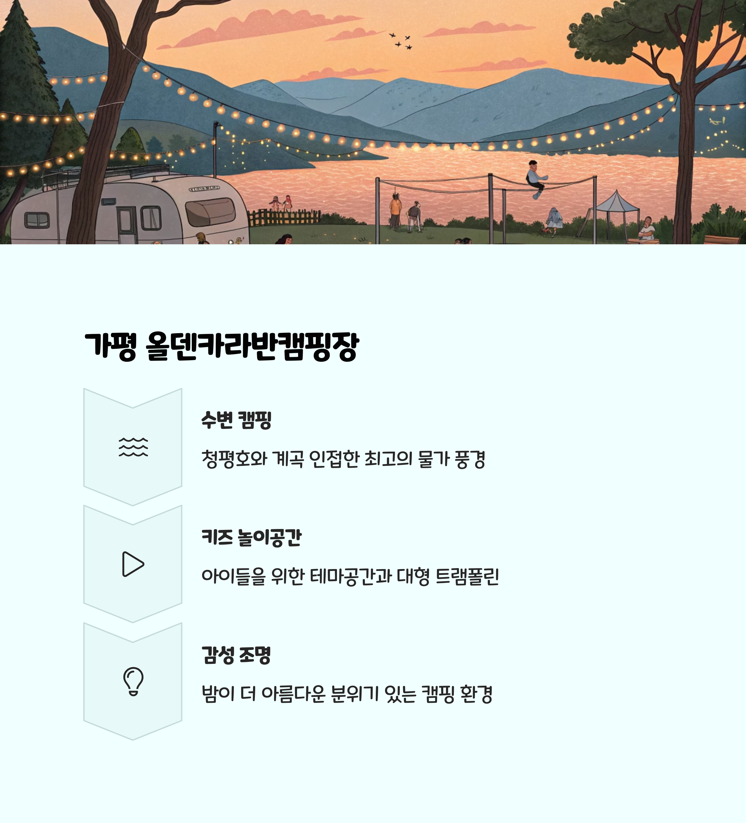 가평의 올덴카라반캠핑장은 반려동물 동반이 가능하며, 자연과 함께 심호흡할 수 있는 산책로와 계곡, 넓은 부지, 프라이빗한 숙박 공간이 특징입니다. 고기와 조식이 포함된 패키지, 아기자기한 소품과 깔끔한 시설, 친절한 서비스로 가족 단위 방문객의 만족도가 높습니다.