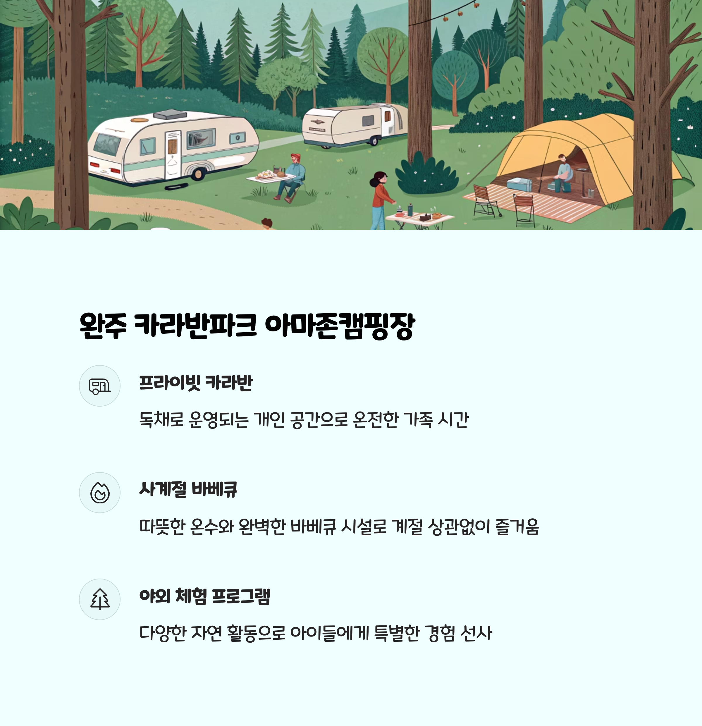 완주군 구이저수지 인근의 카라반파크 아마존캠핑장은 깨끗한 공기와 청정 자연 속에서 가족이 함께 힐링할 수 있는 곳입니다. 카라반 객실, 바비큐장, 워터파크, 산책로 등 다양한 부대시설을 갖추고 있으며, 시설의 청결과 편의성이 특히 호평받고 있습니다. 가족 단위, 지인들과 함께 하룻밤 글램핑 분위기를 즐기기에 최적입니다.