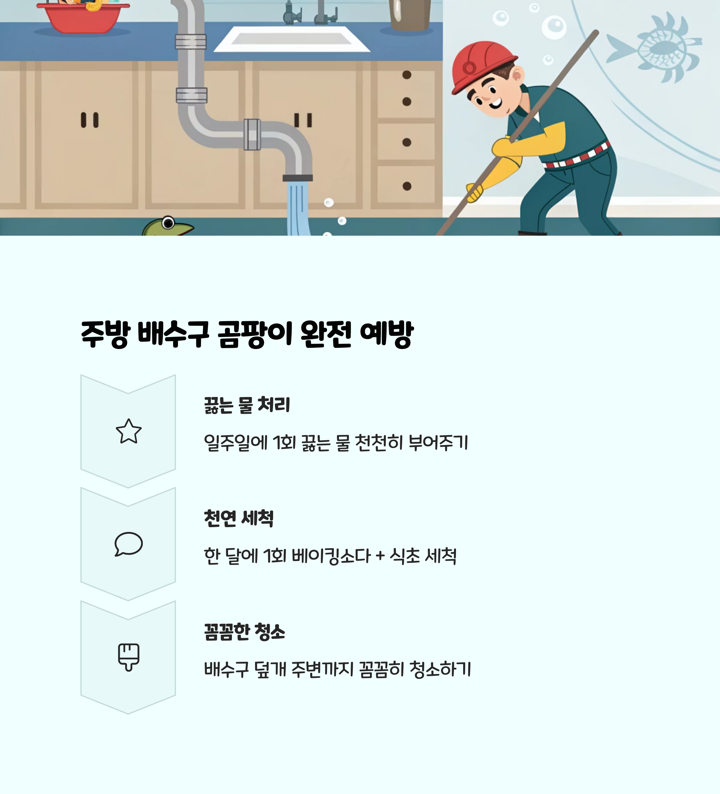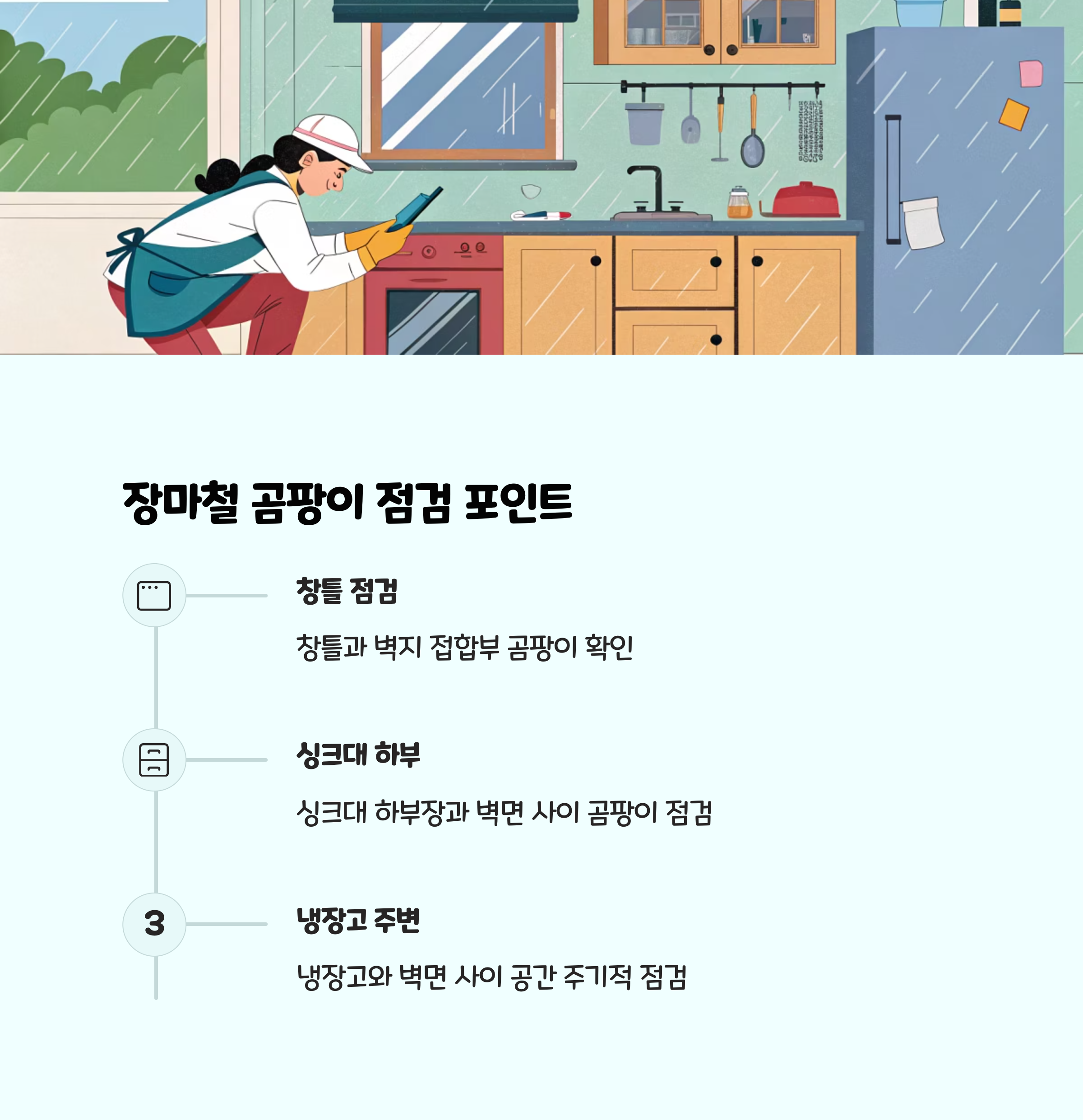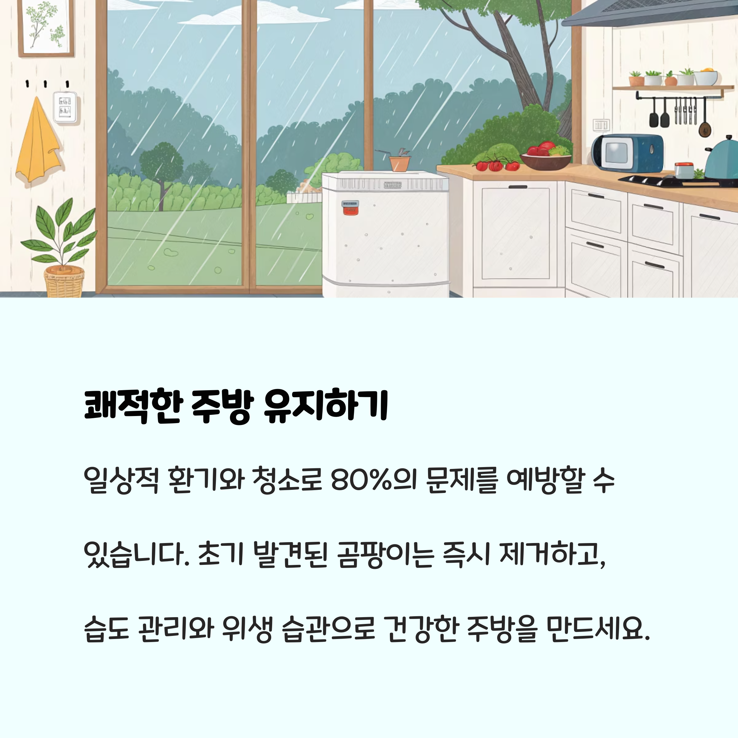 습도 관리: 주방 창문을 자주 열어 환기하고, 가능하다면 제습기를 활용하세요. 실내외 온도 차로 결로가 생기지 않게 실내 온도를 1~2도 높게 유지하는 것도 도움이 됩니다.물기 제거: 설거지 후 싱크대, 벽, 타일에 남은 물기는 반드시 마른행주로 닦아내세요. 물기가 남아 있으면 곰팡이 번식 속도가 2배 이상 빨라집니다.청결한 도구 관리: 행주, 수세미, 도마, 칼 등은 자주 삶거나 소독하고, 장마철에는 일회용 행주를 사용하는 것도 좋습니다. 도마는 끓는 물로 소독 후 레몬즙을 뿌려 말리면 살균 효과가 뛰어납니다.배수구 청소: 베이킹소다 한 컵과 식초 한 컵을 배수구에 붓고, 10~15분 후 뜨거운 물로 헹구면 악취와 곰팡이까지 제거할 수 있습니다.