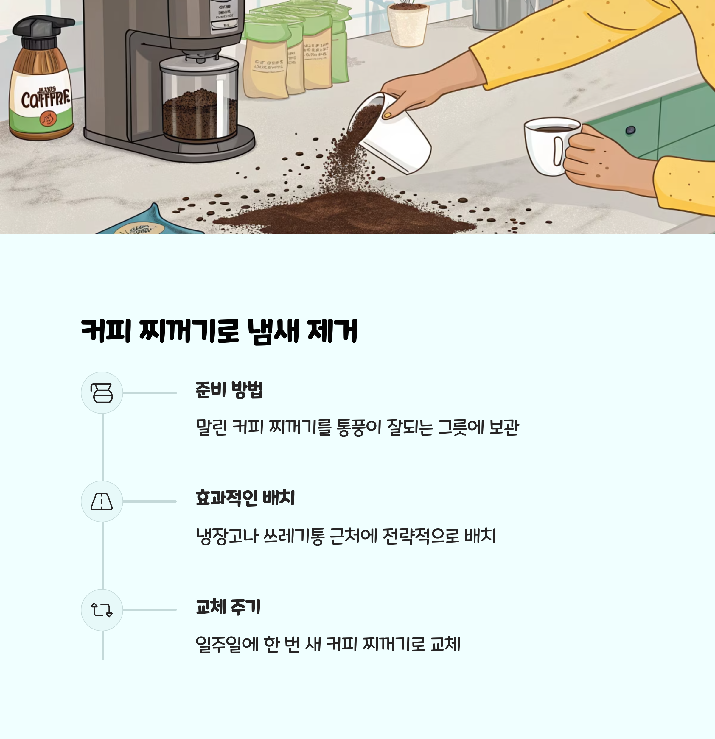 • 천연 탈취제(베이킹소다, 커피 찌꺼기, 녹차 등) 적극 활용