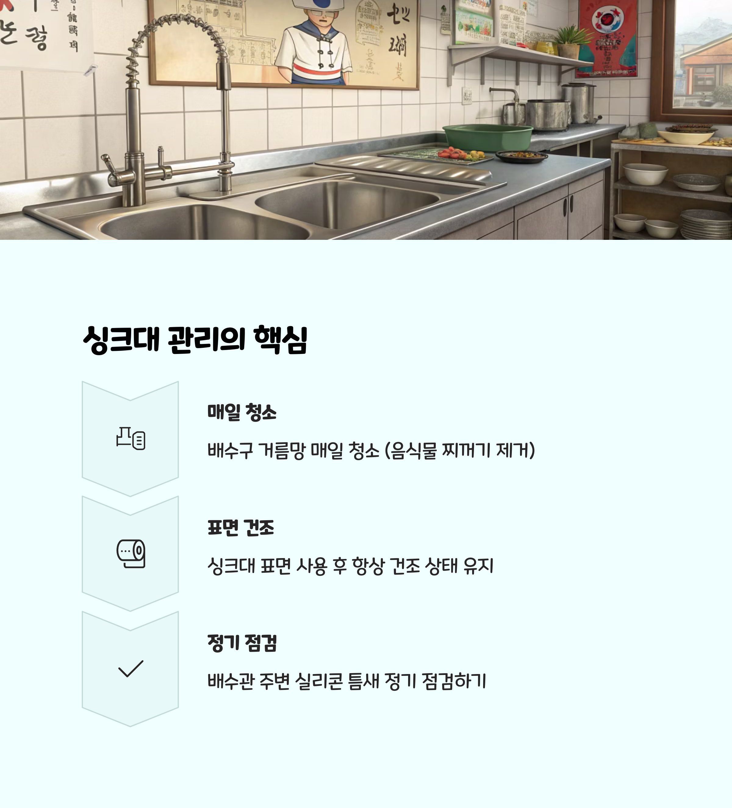 • 물기 제거: 설거지 후 싱크대, 벽, 타일에 남은 물기는 반드시 마른행주로 닦아내세요. 물기가 남아 있으면 곰팡이 번식 속도가 2배 이상 빨라집니다.
