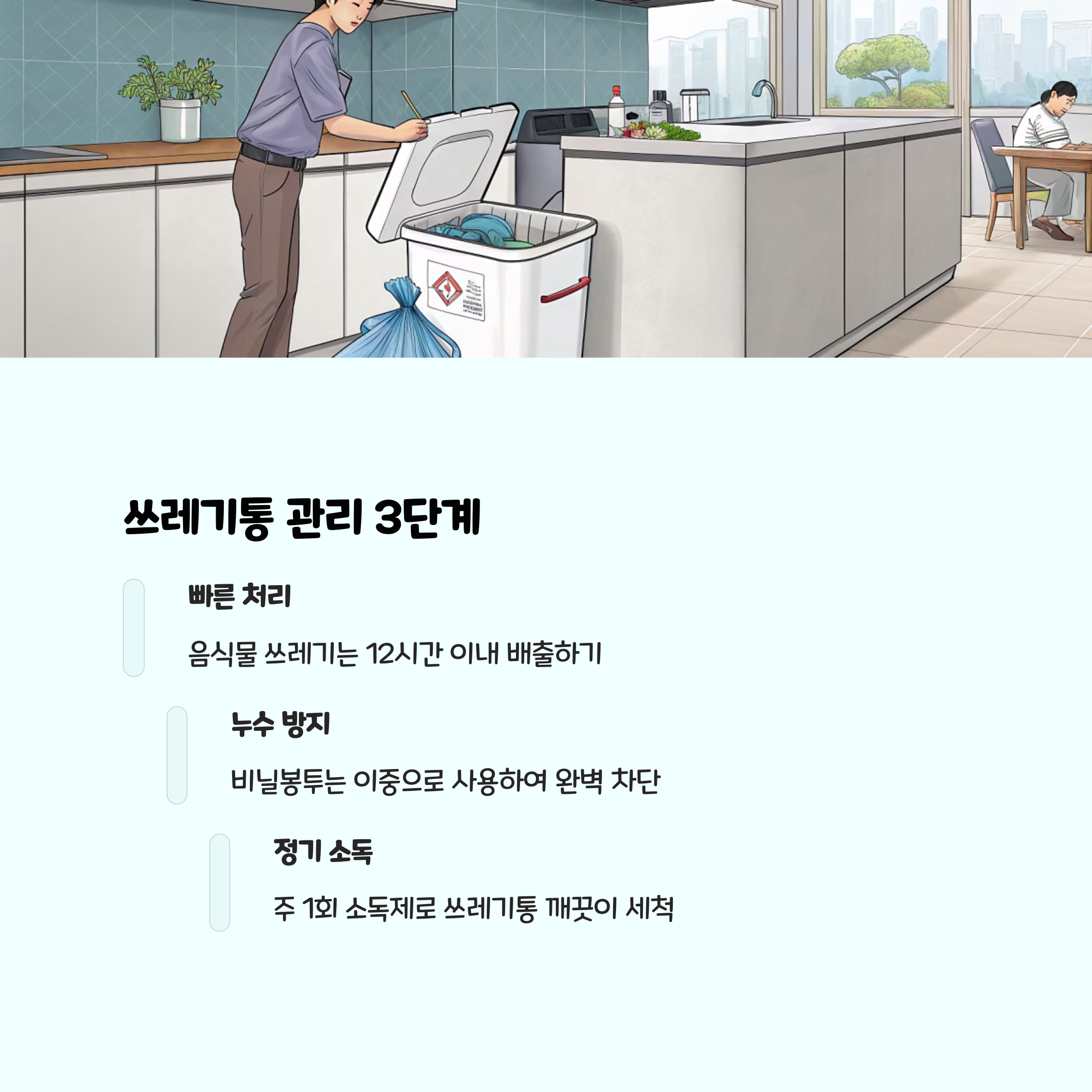 • 정기적인 세척과 소독: 음식물 쓰레기통은 주 2~3회 베이킹소다와 식초로 소독하고, 배수구 트랩도 분리해 솔로 청소하세요.