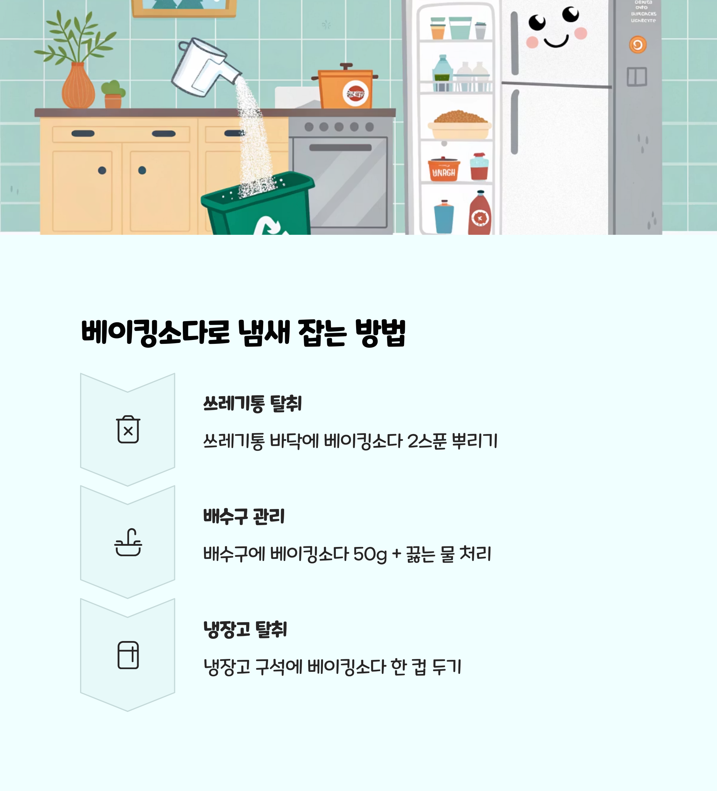음식물 쓰레기통 자주 비우기: 작은 용량의 쓰레기통을 사용해 음식물이 오래 쌓이지 않게 하고, 전용 봉투나 숯 성분 봉투를 활용하면 냄새 차단 효과가 높아집니다.정기적인 세척과 소독: 음식물 쓰레기통은 주 2~3회 베이킹소다와 식초로 소독하고, 배수구 트랩도 분리해 솔로 청소하세요.냉장고 탈취: 냉장고에는 원두 찌꺼기, 레몬·귤껍질, 베이킹소다 등을 넣어두면 음식 냄새를 효과적으로 흡수합니다.